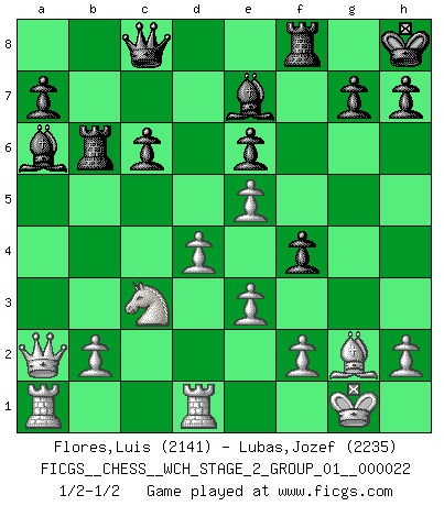 Last move : 1/2-1/2 2020 November 25 1:50:47 [Event "FICGS__CHESS__WCH_STAGE_2_GROUP_01__000022"] [Site "FICGS"] [Date "2020.10.07"] [Round "1"] [White "Flores,Luis"] [Black "Lubas,Jozef"] [Result "1/2-1/2"] [WhiteElo "2141"] [BlackElo "2235"] 1.d4 Nf6 2.c4 e6 3.Nf3 d5 4.g3 Bb4+ 5.Bd2 Be7 6.Bg2 O-O 7.O-O c6 8.Qc2 Nbd7 9.Rd1 b6 10.Bf4 Ba6 11.Ne5 Rc8 12.cxd5 Nxd5 13.Nc3 Nxf4 14.gxf4 Nxe5 15.fxe5 Rc7 16.e3 f5 17.Qb3 Qc8 18.a4 Kh8 19.a5 Rb7 20.axb6 Rxb6 21.Qa2 f4 1/2-1/2 Follow this game move after move (download)Pawn endings are to Chess what putting is to golf. (Cecil Purdy) Am wohlsten fühle ich mich, wenn ich sehe, wie sich mein Gegner im Todeskampf windet. (Robert James Fischer) Bobby Fischer es el mas grande genio de Ajedrez de todos los tiempos. (Alexander Kotov) Il (Jacob Murray) ne joue pas pour le bon coup, mais pour le meilleur. (Eloi Relange) Before all elsed, be armed. (Niccolo Machiavelli)