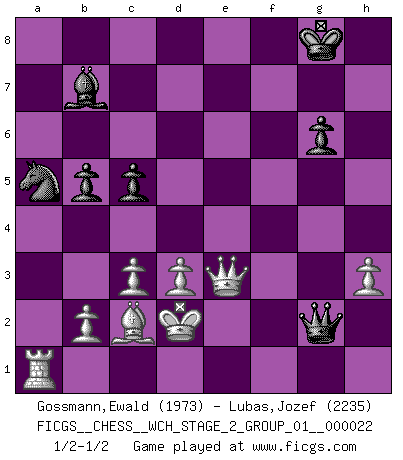 Last move : 1/2-1/2 2020 December 22 12:57:18 [Event "FICGS__CHESS__WCH_STAGE_2_GROUP_01__000022"] [Site "FICGS"] [Date "2020.10.07"] [Round "1"] [White "Gossmann,Ewald"] [Black "Lubas,Jozef"] [Result "1/2-1/2"] [WhiteElo "1973"] [BlackElo "2235"] 1.e4 e5 2.Nf3 Nc6 3.Bb5 a6 4.Ba4 Nf6 5.O-O Be7 6.Re1 b5 7.Bb3 O-O 8.c3 d6 9.h3 Bb7 10.d3 Na5 11.Bc2 c5 12.Nbd2 Re8 13.Nf1 Qc7 14.Ng3 d5 15.exd5 Bxd5 16.Nf5 Bf8 17.Bg5 Re6 18.Ne3 Bb7 19.a4 Rae8 20.axb5 axb5 21.Bxf6 Rxf6 22.Ng4 Rxf3 23.gxf3 h5 24.Nh2 g6 25.f4 Bh6 26.f5 Bf4 27.fxg6 Bxh2+ 28.Kxh2 e4 29.Kg1 e3 30.Rxe3 Rxe3 31.Qxh5 Rg3+ 32.fxg3 Qxg3+ 33.Kf1 Qg2+ 34.Ke1 fxg6 35.Qe2 Qg1+ 36.Kd2 Qg5+ 37.Qe3 Qg2+ 1/2-1/2 Follow this game move after move (download)My opponents make good moves too. Sometimes I don't take these things into consideration. (Bobby Fischer) Das Schachspiel übertrifft alle anderen Spiele so weit wie der Chimborasso einen Misthaufen. (Arthur Schopenhauer) Siempre es mejor sacrificar los hombres de tu oponente. (Savielly Tartakower) Le jeu d'échecs fait naître et fortifie en nous plusieurs qualités précieuses dans le cours de l'existence, telles que la prévoyance, la circonspection, la prudence, et la persévérance. (Benjamin Franklin - 1783, la morale des échecs) Better than a thousand days of diligent study is one day with a great teacher. (Japanese proverb)