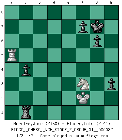 Last move : 1/2-1/2 2021 January 19 20:2:50 [Event "FICGS__CHESS__WCH_STAGE_2_GROUP_01__000022"] [Site "FICGS"] [Date "2020.10.07"] [Round "1"] [White "Moreira,Jose"] [Black "Flores,Luis"] [Result "1/2-1/2"] [WhiteElo "2150"] [BlackElo "2141"] 1.e4 c5 2.Nf3 d6 3.d4 cxd4 4.Nxd4 Nf6 5.Nc3 a6 6.Be3 e5 7.Nb3 Be6 8.f3 Nbd7 9.g4 Nb6 10.g5 Nh5 11.Qd2 Be7 12.O-O-O Rc8 13.Kb1 O-O 14.a3 Qc7 15.Rg1 d5 16.exd5 Nxd5 17.Nxd5 Bxd5 18.Bh3 Rcd8 19.Qf2 Nf4 20.Bf5 g6 21.Bb6 Qc6 22.Na5 Qa4 23.Bg4 Bxg5 24.Bf5 Be7 25.Qe3 Rde8 26.c4 Bxc4 27.b3 Bxb3 28.Qxb3 Qxb3+ 29.Nxb3 Ne2 30.Bd7 Nxg1 31.Bxe8 Ne2 32.Rd2 Rxe8 33.Rxe2 Bxa3 34.Bc5 Bxc5 35.Nxc5 Kg7 36.Re4 a5 37.Re2 b6 38.Nd7 b5 39.Rb2 b4 40.Ra2 e4 41.fxe4 Rxe4 42.Rxa5 h5 43.Kc2 Rh4 44.Ne5 Rxh2+ 45.Kd3 h4 46.Nf3 Rh1 47.Ke3 h3 48.Kf2 Rb1 1/2-1/2 Follow this game move after move (download)I have never in my life played the French Defence, which is the dullest of all openings. (Wilhelm Steinitz) Das typische an einem Großmeister ist, daß er eine gewonnene Position schnell und schmerzlos gewinnt. (Irving Chernev) Aquellos que dicen entender al Ajedrez, no entienden nada. (Robert Hubner) A chaque perte on perd un peu de soi. (Joël Lautier) Creativity involves breaking out of established patterns in order to look at things in a different way. (Edward De Bono)