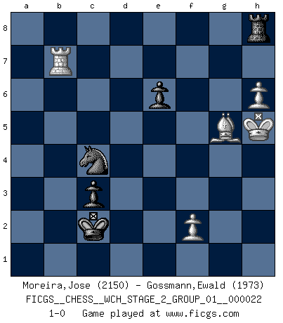 Last move : 1-0 2021 January 20 5:23:58 [Event "FICGS__CHESS__WCH_STAGE_2_GROUP_01__000022"] [Site "FICGS"] [Date "2020.10.07"] [Round "1"] [White "Moreira,Jose"] [Black "Gossmann,Ewald"] [Result "1-0"] [WhiteElo "2150"] [BlackElo "1973"] 1.e4 c6 2.d4 d5 3.Nc3 dxe4 4.Nxe4 Bf5 5.Ng3 Bg6 6.Nf3 Nd7 7.Bd3 Bxd3 8.Qxd3 e6 9.O-O Ngf6 10.Re1 Qc7 11.Nf5 O-O-O 12.Ne3 h6 13.Nc4 g5 14.Bd2 g4 15.Nfe5 Nxe5 16.Nxe5 Bd6 17.Qe2 Rdg8 18.a4 h5 19.a5 h4 20.a6 b6 21.Ra4 h3 22.Rc4 Bxe5 23.dxe5 hxg2 24.Bf4 Nd5 25.Bg3 Ne7 26.Rd1 b5 27.Rf4 Nd5 28.Rxg4 Qb6 29.Rxg8+ Rxg8 30.c4 bxc4 31.Qxc4 Kd7 32.b3 Qb5 33.Kxg2 Kc7 34.h4 Kb6 35.Ra1 Qxc4 36.bxc4 Nb4 37.Kh3 Kc5 38.h5 Kxc4 39.h6 Nd5 40.Kh4 Rh8 41.Kh5 Kb5 42.Bh4 c5 43.Bg5 c4 44.Rg1 c3 45.Rg3 Kxa6 46.Bc1 Kb5 47.Rg7 Nb4 48.Rxf7 Nd3 49.Be3 Nxe5 50.Rc7 Nc4 51.Rb7+ Ka4 52.Rxa7+ Kb3 53.Rb7+ Kc2 54.Bg5 1-0 Follow this game move after move (download)After a bad opening, there is hope for the middle game. After a bad middle game, there is hope for the endgame. But once you are in the endgame, the moment of truth has arrived. (Edmar Mednis) Nur ein wirklich starker Spieler weiß wie schwach er spielt. (Savielly Grigorievitsch Tartakower) El Ajedrez es parte de la cultura, y si una cultura esta en decadencia, entonces también el Ajedrez declinará. (Mikhail Botvinnik) Les Echecs mettent en conflit, non pas deux intelligences, mais deux volontés. (Lasker) All politicians must be presumed guilty until they are proven innocent. (Dinesh De Silva)