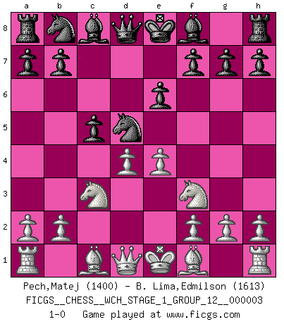Last move : 1-0 2007 September 9 19:35:52 [Event "FICGS__CHESS__WCH_STAGE_1_GROUP_12__000003"] [Site "FICGS"] [Date "2007.07.11"] [Round "1"] [White "Pech,Matej"] [Black "B. Lima,Edmilson"] [Result "1-0"] [WhiteElo "1400"] [BlackElo "1613"] 1.c4 c5 2.Nc3 Nf6 3.Nf3 d5 4.cxd5 Nxd5 5.d4 e6 6.e4 1-0 This chess game has been lost on time (started : 2007.07.11 17:7:55) English : Symmetrical, Three knights system Player White won this chess game. Follow this game move after move (download)Examine moves that smite! A good eye for smites is far more important than a knowledge of strategical principles. (Purdy) Privat ist Kortschnoi kein schlechter Mensch, sehr sympathisch. Aber während des Spiels ist er grausam. Er will dich töten. (Miguel Najdorf) El tablero es el mundo, las piezas es el fenomeno del universo, las reglas del juego son lo que llamamos leyes de la naturaleza y el jugador del lado opuesto, se encuentra oculto a nuestra vista. (Thomas Huxley) J'ai toujours senti une vague pitié pour l'homme qui ne connaît rien aux échecs, tout comme j'en aurais pour un homme ignorant de l'amour. Les Echecs, comme la musique ou comme l'amour, ont le pouvoir de rendre heureux. (Siegbert Tarrasch) Life is like a game of cards: the hand you are dealt represents determinism; the way you play it is free will. (Jawaharlal Nehru)