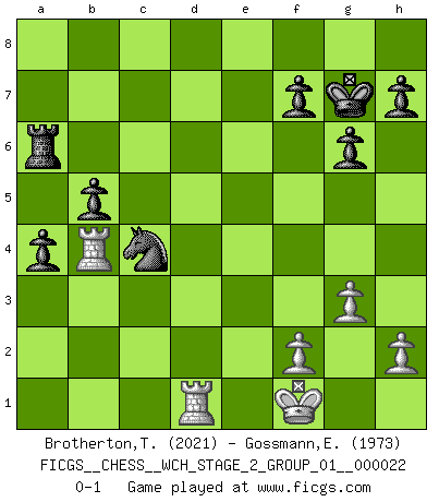 Last move : 0-1 2021 January 9 23:28:56 [Event "FICGS__CHESS__WCH_STAGE_2_GROUP_01__000022"] [Site "FICGS"] [Date "2020.10.07"] [Round "1"] [White "Brotherton,Trevor"] [Black "Gossmann,Ewald"] [Result "0-1"] [WhiteElo "2021"] [BlackElo "1973"] 1.c4 c5 2.g3 g6 3.Bg2 Bg7 4.Nc3 Nc6 5.a3 b6 6.e3 Bb7 7.Nge2 Na5 8.Bxb7 Nxb7 9.d4 Nf6 10.e4 O-O 11.O-O Na5 12.b3 cxd4 13.Nxd4 Nxe4 14.Nxe4 d5 15.Nc3 dxc4 16.Be3 cxb3 17.Rb1 Qd6 18.Qf3 Qxa3 19.Nd5 b2 20.Bh6 Qxf3 21.Nxe7+ Kh8 22.Bxg7+ Kxg7 23.Nxf3 Rfe8 24.Nd5 Nc4 25.Nc7 a5 26.Nxa8 Rxa8 27.Rfd1 a4 28.Ne5 Nxe5 29.Rxb2 Ra6 30.Kf1 Nc4 31.Rb4 b5 0-1 Follow this game move after move (download)Blessed be the memory of him who gave the world this immortal game. (A. G. Gardiner) Ich hatte meine größten Erfolge, als ich 47 Jahre alt war. Kasparow war noch nicht mal 42 und hat das Schach schon im Stich gelassen. (Viktor Kortschnoi) Los asuntos humanos son como una partida de Ajedrez: solo aquellos que no lo toman seriamente, pueden ser llamados buenos jugadores. (Hung Tzu Ch'eng) Nous vivons dans un monde échiquéen : chaque jour qui passe est un défi à relever. (Philosophe Sasha) To send light into the darkness of men's hearts - such is the duty of the artist. (Schumann)