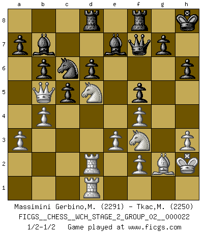 Last move : 1/2-1/2 2021 January 13 0:48:20 [Event "FICGS__CHESS__WCH_STAGE_2_GROUP_02__000022"] [Site "FICGS"] [Date "2020.10.07"] [Round "1"] [White "Massimini Gerbino,Massimiliano"] [Black "Tkac,Matus"] [Result "1/2-1/2"] [WhiteElo "2291"] [BlackElo "2250"] 1.d4 Nf6 2.c4 e6 3.Nf3 b6 4.g3 Ba6 5.Qc2 c5 6.d5 exd5 7.cxd5 Bb7 8.Bg2 Nxd5 9.O-O Nc6 10.Rd1 Be7 11.a3 Nc7 12.Bf4 O-O 13.Nc3 Ne6 14.Rd2 d6 15.Rad1 Nxf4 16.gxf4 Qd7 17.h3 Rad8 18.e3 h6 19.Nd5 f5 20.b4 Kh8 21.Kh2 Qe8 22.Qc4 Qf7 23.Qb5 Qe8 24.Qf1 Qf7 25.Qb5 1/2-1/2 Follow this game move after move (download)The combination player thinks forward; he starts from the given position, and tries the forceful moves in his mind. (Emanuel Lasker) Mit Schach schule ich mein Gefühl für Geometrie, was für Tennis und Schach gleichermaßen wichtig ist. (Boris Becker) Combinaciones deslumbrantes son para la mayoría, mover madera es para los pocos. (Georg Kieninger) Les échecs sont utiles à l'exercice de la faculté de penser et à celle de l'imagination. Car nous devons posséder une méthode élaborée pour atteindre des buts partout où nous devons conduire notre raison. (Leibnitz) History is a gallery of pictures in which there are few originals and many copies. (Alexis de Tocqueville)