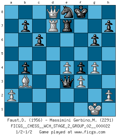 Last move : 1/2-1/2 2021 January 23 15:11:29 [Event "FICGS__CHESS__WCH_STAGE_2_GROUP_02__000022"] [Site "FICGS"] [Date "2020.10.07"] [Round "1"] [White "Faust,Dieter"] [Black "Massimini Gerbino,Massimiliano"] [Result "1/2-1/2"] [WhiteElo "1956"] [BlackElo "2291"] 1.d4 f5 2.g3 Nf6 3.Bg2 g6 4.Nf3 Bg7 5.O-O O-O 6.c4 d6 7.Nc3 c6 8.d5 e5 9.dxe6 Bxe6 10.b3 Na6 11.Ng5 Bc8 12.Bb2 Qe7 13.Qc2 Bd7 14.Rad1 Rad8 15.Nh3 Nc5 16.Rfe1 Rfe8 17.e3 Be6 18.Ne2 Nfe4 19.Bd4 Bf7 20.f3 Nf6 21.Ng5 Nh5 22.Nxf7 Kxf7 23.b4 Bxd4 24.Nxd4 Ne6 25.Nxe6 Qxe6 26.e4 f4 27.g4 Ng7 28.Bf1 Qe5 29.Qf2 a5 30.c5 axb4 31.cxd6 Rxd6 32.Bc4+ Kf8 33.Qb6 Re7 34.Bb3 Rxd1 35.Rxd1 Qc3 36.Qd8+ Ne8 37.Rd7 Qe3+ 1/2-1/2 Follow this game move after move (download)Chess is a cold bath for the mind. (Sir John Simon) Wie kann ich Remis annehmen? Ich weiß ja gar nicht, wie ich stehe! (Fritz Sämisch) No soy una persona materialista y por eso, no resiento la falta o pérdida del dinero. La ausencia de cosas mundanas carece de importancia. Ya que el Ajedrez es una forma en la que puedo ser tan materialista como yo desee sin tener la necesidad de vender mi alma. (Jamie Walter Adams) Les échecs c'est le défi de l'alpiniste, toujours plus haut, prêt à tout pour monter à l'assaut du Roi ennemi. Les échecs, c'est de la musique en mouvement, un ballet majestueux pour les yeux. C'est de la poésie composée par les fantômes du passé qui au même titre que Rimbaud ou Verlaine méritent notre admiration. Les échecs, c'est de la peinture ou le moindre mouvement modifie le tableau pour en faire un Picasso ou un Van Gogh. Les échecs, c'est tout et rien, c'est la vie et la mort. Jjulie33 sur le forum de France-Echecs. But they are useless. They can only give you answers. (Pablo Picasso, about computers)