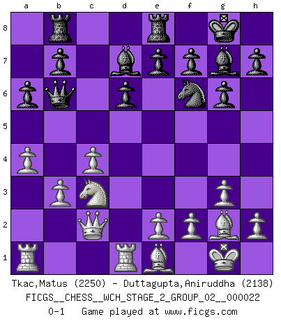Last move : 0-1 2021 January 27 15:18:2 [Event "FICGS__CHESS__WCH_STAGE_2_GROUP_02__000022"] [Site "FICGS"] [Date "2020.10.07"] [Round "1"] [White "Tkac,Matus"] [Black "Duttagupta,Aniruddha"] [Result "0-1"] [WhiteElo "2250"] [BlackElo "2138"] 1.Nf3 Nf6 2.c4 c5 3.Nc3 Nc6 4.g3 g6 5.d4 cxd4 6.Nxd4 Bg7 7.Bg2 O-O 8.O-O Nxd4 9.Qxd4 d6 10.Qd3 a6 11.Bd2 Bd7 12.b3 Rb8 13.a4 Re8 14.Rfd1 Ng4 15.Qc2 Qb6 16.Be1 Nf6 0-1 This chess game has been lost on time (started : 2020.10.07 20:31:40) Follow this game move after move (download)Chess is a forcing house where the fruits of character can ripen more fully than in life. (Edward Morgan Foster) Ein Schachgenie ist jemand der verdammt gut Schach spielt. (Jonathan Levitt) Ayuda a tus piezas para que ellas te puedan ayudar. (Paul Morphy) À la honte des hommes, on sait que les lois du jeu sont les seules qui soient partout justes, claires, inviolables et exécutées. Pourquoi l'Indien qui a donné les règles du jeu d'échecs est-il obéi de bon gré dans toute la terre, et que les décrétales des papes, par exemple, sont aujourd'hui un objet d'horreur et de mépris ? C'est que l'inventeur des échecs combina tout avec justesse pour la satisfaction des joueurs, et que les papes, dans leurs décrétales, n'eurent en vue que leur seul avantage. L'Indien voulut exercer également l'esprit des hommes et leur donner du plaisir; les papes ont voulu abrutir l'esprit des hommes. Voltaire (Dictionnaire philosophique / Garnier 1967) The man who strikes first admits that his ideas have given out. (Chinese proverb)