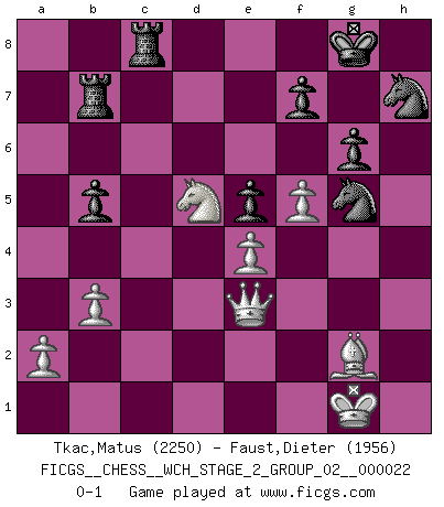 Last move : 0-1 2021 February 2 5:23:57 [Event "FICGS__CHESS__WCH_STAGE_2_GROUP_02__000022"] [Site "FICGS"] [Date "2020.10.07"] [Round "1"] [White "Tkac,Matus"] [Black "Faust,Dieter"] [Result "0-1"] [WhiteElo "2250"] [BlackElo "1956"] 1.c4 c5 2.Nf3 Nf6 3.Nc3 e6 4.g3 b6 5.Bg2 Bb7 6.O-O Be7 7.d4 cxd4 8.Qxd4 d6 9.e4 O-O 10.Qe3 Nbd7 11.Nd4 Qc7 12.b3 a6 13.Bb2 Rfe8 14.Rfe1 Bf8 15.Rad1 Rad8 16.Qd2 g6 17.Nc2 Rc8 18.Nd4 Red8 19.h3 Bg7 20.Qe3 h5 21.Re2 Nc5 22.Red2 e5 23.Nde2 Kh7 24.g4 hxg4 25.hxg4 Kg8 26.g5 Nh7 27.Nd5 Bxd5 28.Rxd5 Ne6 29.Ba3 Bf8 30.f4 b5 31.f5 Nexg5 32.Bb4 Be7 33.cxb5 axb5 34.Nc3 Qd7 35.Rxe5 dxe5 36.Rxd7 Rxd7 37.Bxe7 Rxe7 38.Nd5 Rb7 0-1 This chess game has been lost on time (started : 2020.10.07 20:31:40) Follow this game move after move (download)As one by one I mowed them down, my superiority soon became apparent. (Jose Capablanca) Bis jetzt ist Weiß einer wohlbekannten Analyse gefolgt. Aber jetzt begeht er einen schrecklichen Fehler: Er beginnt seinen eigenen Kopf zu benutzen. (Siegbert Tarrasch) Al jugar al Ajedrez entonces, podemos aprender: Primero: Previsión... Segundo: Prudencia... Tercero: Cautela... Y al final, aprendemos del Ajedrez el hábito de no ser desanimados por apariencias malas presentes en el estado de nuestros asuntos, el hábito de la esperanza por una oportunidad favorable y la perseveración de los secretos de los recursos. (Benjamin Franklin) On n'a jamais que l'âge auquel on a commence à jouer aux échecs car après on cesse de vieillir. (Capablanca) Good luck. You're gonna need it. (Han Solo in Star Wars ep.6)