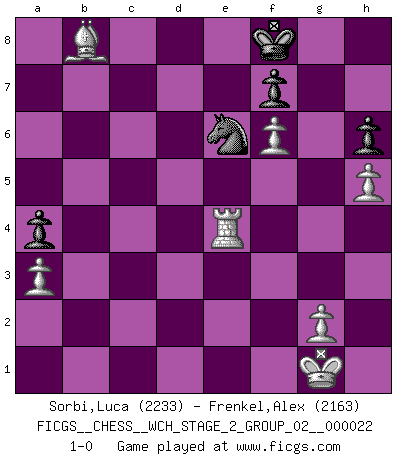 Last move : 1-0 2020 December 12 17:29:6 [Event "FICGS__CHESS__WCH_STAGE_2_GROUP_02__000022"] [Site "FICGS"] [Date "2020.10.07"] [Round "1"] [White "Sorbi,Luca"] [Black "Frenkel,Alex"] [Result "1-0"] [WhiteElo "2233"] [BlackElo "2163"] 1.d4 Nf6 2.c4 e6 3.Nc3 Bb4 4.e3 O-O 5.Bd3 d5 6.Nf3 b6 7.O-O Ba6 8.cxd5 exd5 9.Bxa6 Nxa6 10.Bd2 Re8 11.Rc1 Qc8 12.a3 Bxc3 13.Bxc3 c6 14.b3 Qb7 15.Bb2 Rac8 16.Ne5 Nd7 17.h4 Nxe5 18.dxe5 Qe7 19.h5 Nc5 20.b4 Ne4 21.b5 cxb5 22.Rxc8 Rxc8 23.Qxd5 Nc5 24.f4 Rd8 25.Qf3 h6 26.Qg4 a5 27.Bd4 a4 28.f5 Qg5 29.Qh3 Nb3 30.Bxb6 Re8 31.Bd4 Rd8 32.Bb2 Rd3 33.f6 Qxe3+ 34.Qxe3 Rxe3 35.Rd1 Nc5 36.Rd5 Ne6 37.Rxb5 gxf6 38.exf6 Nf4 39.Be5 Re4 40.Bb8 Ne6 41.Rb4 Kf8 42.Rxe4 1-0 Follow this game move after move (download)To avoid losing a piece, many a person has lost the game. (Savielly Tartakover) Der Vorposten provoziert a) eine Basis für neue Angriffe und b) eine Schwächung der gegnerischen Widerstandskraft in der fraglichen Linie. (Aaron Nimzowitsch) Con el fin de mejorar tu juego, debes de estudiar los finales antes que todo, ya que mientras que los finales pueden ser estudiados y dominados por sí mismos, el juegomedio y la apertura deben de ser estudiados en relación con los finales. (José Raúl Capablanca) Il n'y a plus de joueurs du niveau de Jacob Murray dont la seule quête est le beau jeu, le plaisir de voir les pièces construire quelque chose. Sur 10 idées à la minute, 9 seront sans intérêt, la dernière s'avèrera géniale. (Christian Bauer) The ego is not master in its own house. (Sigmund Freud)