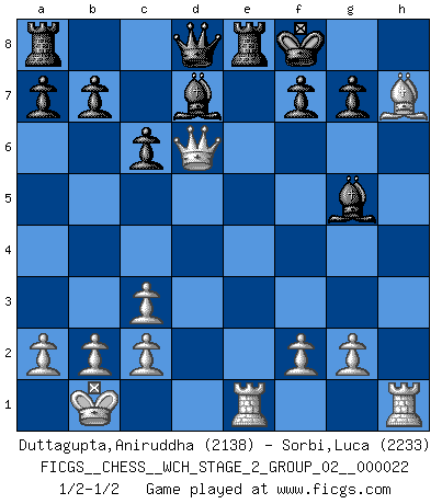 Last move : 1/2-1/2 2021 January 7 22:23:50 [Event "FICGS__CHESS__WCH_STAGE_2_GROUP_02__000022"] [Site "FICGS"] [Date "2020.10.07"] [Round "1"] [White "Duttagupta,Aniruddha"] [Black "Sorbi,Luca"] [Result "1/2-1/2"] [WhiteElo "2138"] [BlackElo "2233"] 1.e4 e5 2.Nf3 Nf6 3.Nxe5 d6 4.Nf3 Nxe4 5.Nc3 Nxc3 6.dxc3 Be7 7.Be3 O-O 8.Qd2 Nd7 9.O-O-O c6 10.h4 Nf6 11.Bd3 Re8 12.Rde1 Bd7 13.Ng5 h6 14.Kb1 Nd5 15.Bh7+ Kf8 16.Bf4 Nxf4 17.Qxf4 hxg5 18.hxg5 Bxg5 19.Qxd6+ 1/2-1/2 Follow this game move after move (download)Could we look into the head of a Chess player, we should see there a whole world of feelings, images, ideas, emotion and passion. (Alfred Binet) Der Knackpunkt bei der Konzentration ist, daß wir nur durch sie etwas Neues und Ungewöhnliches am Schachbrett finden können. Sie ist der einzige Weg durch neue neue Ideen eine Überraschung zu bereiten. (Garry Kasparov) Si tu oponente te ofrece un empate, trata de averiguar porque piensa él que esta en una posición peor. (Nigel Short) Si rien de grave n'est détecté lors de l'analyse d'une position, on joue alors le coup. Seconde règle de Blumenfeld. Convictions are more dangerous enemies of truth than lies. (Friedrich Nietzsche)