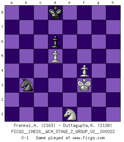 Last move : 0-1 2021 April 9 22:14:7 [Event "FICGS__CHESS__WCH_STAGE_2_GROUP_02__000022"] [Site "FICGS"] [Date "2020.10.07"] [Round "1"] [White "Frenkel,Alex"] [Black "Duttagupta,Aniruddha"] [Result "0-1"] [WhiteElo "2163"] [BlackElo "2138"] 1.e4 c5 2.Nf3 d6 3.d4 cxd4 4.Nxd4 Nf6 5.Nc3 a6 6.Be3 e5 7.Nb3 Be6 8.Qd2 Nbd7 9.f3 h5 10.Nd5 Bxd5 11.exd5 g6 12.O-O-O Nb6 13.Qa5 Bh6 14.Bxh6 Rxh6 15.Qd2 Rh7 16.f4 Nbd7 17.g3 Rc8 18.Bd3 h4 19.Kb1 Kf8 20.Rhf1 e4 21.Be2 hxg3 22.hxg3 Qb6 23.g4 Re8 24.Rh1 Rxh1 25.Rxh1 e3 26.Qd3 Qb4 27.c4 b5 28.g5 Nh5 29.Bxh5 gxh5 30.Rxh5 Qe1+ 31.Nc1 Ke7 32.Rh7 Kd8 33.Qe2 Qg3 34.Rxf7 Re7 35.Rxe7 Kxe7 36.cxb5 axb5 37.Nd3 Qh3 38.b3 Qh1+ 39.Ne1 Qg1 40.Kc2 Qf2 41.Kd1 Qg1 42.Qxb5 Nc5 43.Qe2 Kd8 44.g6 Qxg6 45.Qxe3 Qb1+ 46.Ke2 Qxa2+ 47.Kf3 Qxb3 48.Qxb3 Nxb3 0-1 Follow this game move after move (download)If I win a tournament, I win it by myself. I do the playing. Nobody helps me. (Bobby Fischer) Schach ist mein Leben, meine Leidenschaft, was ich gelernt habe und seit meinem 14. Lebensjahr profimässig praktiziere. Darauf zu verzichten, würde mir sehr schwer fallen. (Viktor Kortschnoi) Un mal plan es mejor que no tener ningún plan. (Frank Marshall) Le joueur d'Echecs qui veut atteindre le top est obligé de développer son propre credo créatif. Alexeï Stepanovicth Souétine. Il est facile d'écrire des livres ! Ce qui est difficile, c'est de jouer ! (Alexeï Stepanovicth Souétine) Who needs drugs and alcohol if he can play Big Chess at FICGS ? (Heinz-Georg Lehnhoff)