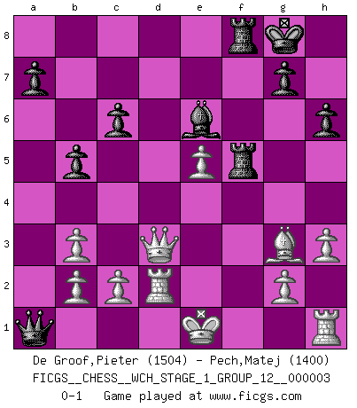 Last move : 0-1 2007 November 9 14:5:43 [Event "FICGS__CHESS__WCH_STAGE_1_GROUP_12__000003"] [Site "FICGS"] [Date "2007.07.11"] [Round "1"] [White "De Groof,Pieter"] [Black "Pech,Matej"] [Result "0-1"] [WhiteElo "1504"] [BlackElo "1400"] 1.e4 e5 2.f4 Bc5 3.Nf3 d6 4.Nc3 Nf6 5.Bc4 Nc6 6.fxe5 dxe5 7.d3 Na5 8.Bb5+ c6 9.Ba4 O-O 10.Bg5 b5 11.Bb3 h6 12.Bh4 Qd6 13.Bg3 Ng4 14.Qe2 Re8 15.h3 Ne3 16.Bh2 Nxb3 17.axb3 f5 18.Nd1 Nxd1 19.Rxd1 f4 20.d4 exd4 21.e5 Qe7 22.Bxf4 Rf8 23.Bg3 Be6 24.Bh4 Qc7 25.Nxd4 Bxd4 26.Rxd4 Rf5 27.Bg3 Qa5+ 28.Rd2 Raf8 29.Qd3 Qa1+ 0-1 KGD : Classical variation Kingside Castling by player Black (move 9) Player Black won this chess game. Follow this game move after move (download)The only thing Chess players have in common is Chess. (Lodewijk Prins) Wenn man heute mit 14 Jahren noch kein GM ist, kann man es vergessen. (Viswanathan Anand) Cuando no sepas que mover, espera por una idea que se le venga a la la cabeza de tu oponente. Tenlo por seguro de que esa idea estará incorrecta. (Siegbert Tarrasch) Les sacrifices démontrent seulement que quelqu'un a gaffé. (Savielly Tartacover) The next best thing to gambling and winning is gambling and loosing. (Nick Dandalos)