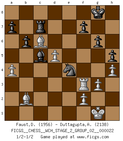 Last move : 1/2-1/2 2021 March 20 8:1:30 [Event "FICGS__CHESS__WCH_STAGE_2_GROUP_02__000022"] [Site "FICGS"] [Date "2020.10.07"] [Round "1"] [White "Faust,Dieter"] [Black "Duttagupta,Aniruddha"] [Result "1/2-1/2"] [WhiteElo "1956"] [BlackElo "2138"] 1.d4 Nf6 2.Nf3 g6 3.c4 Bg7 4.Nc3 d5 5.Qb3 dxc4 6.Qxc4 O-O 7.e4 Nc6 8.Be2 Bg4 9.d5 Na5 10.Qb4 Bxf3 11.Bxf3 c6 12.O-O Qb6 13.Qa4 Nd7 14.Rd1 Rfd8 15.g3 h5 16.Bg2 Ne5 17.h3 Nec4 18.Qc2 Qb4 19.Rb1 Nb6 20.Bg5 Nac4 21.a3 Nxa3 22.bxa3 Qxc3 23.Qxc3 Bxc3 24.Bxe7 Rd7 25.Bg5 cxd5 26.exd5 Be5 27.h4 Bd6 28.Rb3 Rc7 29.Ra1 Nc4 30.a4 Kg7 31.Rc1 b6 32.Rf3 Rac8 33.Re1 Bb4 34.Re4 Bf8 35.Re1 Nd6 36.Bh3 Rb8 37.Bf1 Re8 38.Rxe8 Nxe8 39.Bb5 Nd6 40.Bf6+ Kg8 41.Bc6 Ne4 42.Bb2 Bc5 1/2-1/2 Follow this game move after move (download)Openings teach you openings. Endgames teach you chess ! (Stephan Gerzadowicz) Alle Schachspieler sollten auch ein Hobby haben. (Savielly Grigorievitsch Tartakower) Cuando me preguntan: -¿Cual es el secreto que te hace hacer mejores movidas que tus oponentes?, Yo respondo: Me da gusto que me pregunten eso, porque, como veran, hay una simple razón. Yo pienso mis propias movidas y dejo a mi oponente que el piense las suyas. (Alexander Alekhine) Les ravages du H expliquent la différence de niveau entre Tal et Thal [Abergel]. Art is the triumph over chaos. (John Cheever)