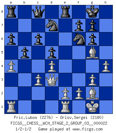 Last move : 1/2-1/2 2021 January 6 19:47:7 [Event "FICGS__CHESS__WCH_STAGE_2_GROUP_03__000022"] [Site "FICGS"] [Date "2020.10.07"] [Round "1"] [White "Fric,Lubos"] [Black "Orlov,Vladimir"] [Result "1/2-1/2"] [WhiteElo "2276"] [BlackElo "2180"] 1.Nf3 Nf6 2.g3 d5 3.Bg2 c6 4.O-O Bg4 5.h3 Bh5 6.c4 e6 7.d4 Nbd7 8.cxd5 exd5 9.Nc3 Bd6 10.Nh4 O-O 11.Qd3 Bg6 12.Nxg6 hxg6 13.h4 Re8 14.Bg5 Bb4 15.a3 Bxc3 16.bxc3 b5 17.a4 a6 18.Rfe1 Qc8 1/2-1/2 Follow this game move after move (download)All Chess players should have a hobby. (Savielly Tartakower) Wie gewinnt Tal? Er entwickelt alle seine Figuren in die Brettmitte und opfert sie dann irgendwo. (Robert James Fischer) No es suficiente ser un buen jugador, se debe también de jugar bién. (Siegbert Tarrasch) Ne tendez aucun piège pour le plaisir ! Ne jouez rien dans l'espoir que l'adversaire réagisse de façon stupide ! Prenez toujours pour acquis que l'adversaire va trouver le meilleur coup ! Ne jouez jamais de coup dans l'espoir que l'adversaire ne voie pas la menace ! Chacun de vos coups doit améliorer la position d'une façon ou d'une autre. However beautiful the strategy, you should occasionally look at the results. (Winston Churchill)