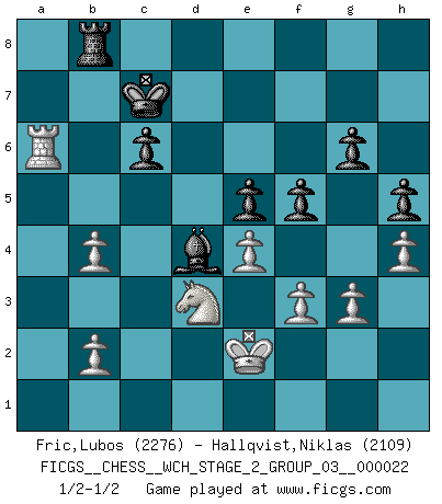 Last move : 1/2-1/2 2021 February 10 22:19:1 [Event "FICGS__CHESS__WCH_STAGE_2_GROUP_03__000022"] [Site "FICGS"] [Date "2020.10.07"] [Round "1"] [White "Fric,Lubos"] [Black "Hallqvist,Niklas"] [Result "1/2-1/2"] [WhiteElo "2276"] [BlackElo "2109"] 1.Nf3 c5 2.e4 g6 3.d4 cxd4 4.Nxd4 Nf6 5.Nc3 Nc6 6.Nxc6 dxc6 7.Qxd8+ Kxd8 8.Bc4 Ke8 9.a4 e5 10.a5 Bb4 11.f3 Ke7 12.Be3 Be6 13.Bxe6 Kxe6 14.Ke2 h5 15.Nd1 Rhd8 16.Nf2 Nd7 17.Rhd1 Be7 18.g3 Nc5 19.Rdb1 f5 20.Ra3 Nd7 21.Rb3 b5 22.axb6 axb6 23.Bxb6 Rdb8 24.Be3 Rxb3 25.cxb3 Rb8 26.Rc1 Kd6 27.Rc3 Bd8 28.Rd3+ Ke6 29.Rc3 Kd6 30.Nd3 Ba5 31.Bc5+ Nxc5 32.Rxc5 Rb5 33.b4 Bb6 34.Rc1 Bd4 35.Ra1 Rb8 36.h3 Ke6 37.Ra6 Kd6 38.h4 Kc7 39.Ra5 Kd6 40.Ra4 Kc7 41.Ra6 1/2-1/2 Follow this game move after move (download)I love all positions. Give me a difficult positional game, I will play it. But totally won positions, I cannot stand them. (Hein Donner) Es ist schade, dass viele Schachsportler vergessen, wie wichtig Auftreten und angemessene Kleidung sind. (Alexandra Kosteniuk) Un mal día en el Ajedrez, es mejor que cualquier buen día en el trabajo. (Anonymous) Ce qui est bien, c'est d'avoir tout un tas de pièces en prise : l'adversaire ne peut en prendre qu'une à la fois. Cité par Thierry Audin. Don't anthropomorphize computers - they hate it. (Anonymous)