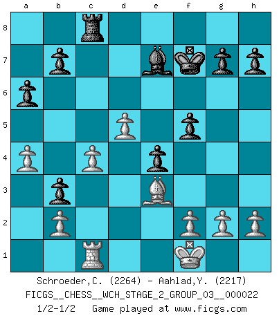 Last move : 1/2-1/2 2020 November 1 0:32:48 [Event "FICGS__CHESS__WCH_STAGE_2_GROUP_03__000022"] [Site "FICGS"] [Date "2020.10.07"] [Round "1"] [White "Schroeder,Christoph"] [Black "Aahlad,Yeturu"] [Result "1/2-1/2"] [WhiteElo "2264"] [BlackElo "2217"] 1.e4 c5 2.Nf3 d6 3.d4 cxd4 4.Nxd4 Nf6 5.Nc3 a6 6.a3 Nc6 7.Be2 e5 8.Nb3 Be7 9.Qd3 O-O 10.O-O Be6 11.Be3 Rc8 12.Rfd1 Nd7 13.Rac1 Nc5 14.Nxc5 dxc5 15.Qxd8 Rcxd8 16.Nd5 Bxd5 17.Rxd5 Rxd5 18.exd5 Nd4 19.Bg4 f5 20.Bd1 c4 21.c3 Nb3 22.Bxb3 cxb3 23.c4 Rc8 24.a4 Kf7 25.Kf1 e4 1/2-1/2 Sicilian : Najdorf Kingside Castling by player Black (move 9) Kingside Castling by player White (move 10) This chess game ended in a draw. Follow this game move after move (download)A big shock; the best chess player in history has passed away. (Lajos Portisch, about Bobby Fischer's death) Warum muß ich gegen diesen IDIOTEN verlieren? (Aaron Nimzowitsch) La estratégia requiere pensar, la táctica requiere observación. (Max Euwe) J'ai toujours senti une vague pitié pour l'homme qui ne connaît rien aux échecs, tout comme j'en aurais pour un homme ignorant de l'amour. Les Echecs, comme la musique ou comme l'amour, ont le pouvoir de rendre heureux. (Siegbert Tarrasch) As a goal marker shodan is important. As a destination it is a poor place to stop. (Thomas Tamayo)