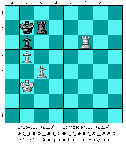 Last move : 1/2-1/2 2020 October 17 15:59:39 [Event "FICGS__CHESS__WCH_STAGE_2_GROUP_03__000022"] [Site "FICGS"] [Date "2020.10.07"] [Round "1"] [White "Orlov,Vladimir"] [Black "Schroeder,Christoph"] [Result "1/2-1/2"] [WhiteElo "2180"] [BlackElo "2264"] 1.e4 e6 2.d4 d5 3.Nc3 dxe4 4.Nxe4 Nd7 5.Nf3 Ngf6 6.Nxf6+ Nxf6 7.c3 c5 8.Ne5 a6 9.Be3 Qc7 10.Qa4+ Nd7 11.Bb5 cxd4 12.Bxd7+ Bxd7 13.Qxd4 f6 14.Nxd7 Qxd7 15.Qxd7+ Kxd7 16.O-O-O Kc7 17.a4 a5 18.Rd4 Ra6 19.Rhd1 Rd6 20.Rxd6 Bxd6 21.Bb6+ Kc6 22.Bxa5 Ra8 23.b4 Be5 24.g3 g5 25.Kc2 b6 26.b5+ Kc7 27.Bb4 Rxa4 28.Kb3 Ra8 29.Re1 Kd7 30.h4 gxh4 31.Rh1 hxg3 32.Rxh7+ Kc8 33.fxg3 Bxg3 34.Re7 Be5 35.Rxe6 Kc7 36.Rc6+ Kb7 37.Be7 Rc8 38.Bxf6 Bxf6 39.Rxf6 Rc7 40.c4 1/2-1/2 French : Rubinstein variation Queenside Castling by player White (move 16) 10 pieces endgame at move 35 : White KRBPP , Black KRBPP WHITE : King + 1 Rook 1 Bishop 2 Pawns BLACK : King + 1 Rook 1 Bishop 2 Pawns 9 pieces endgame at move 38 : White KRBPP , Black KRBP WHITE : King + 1 Rook 1 Bishop 2 Pawns BLACK : King + 1 Rook 1 Bishop 1 Pawn 8 pieces endgame at move 38 : White KRPP , Black KRBP WHITE : King + 1 Rook 2 Pawns BLACK : King + 1 Rook 1 Bishop 1 Pawn 7 pieces endgame at move 39 : White KRPP , Black KRP WHITE : King + 1 Rook 2 Pawns BLACK : King + 1 Rook 1 Pawn This chess game ended in a draw. Follow this game move after move (download)By this measure (on the gap between Fischer & his contemporaries), I consider him the greatest world champion. (Garry Kasparov) Spielt Blackmar-Diemer-Gambit, und das Matt kommt von selbst! (Emil Joseph Diemer) El jugador blanco perdió porque fallo en recordar la coreccta continuación y tuvo que pensar por sí mismo las movidas. (Siegbert Tarrasch) Les échecs sont un jeu par leur forme, un art par leur essence et une science par sa difficulté d'acquisition. Ils peuvent vous procurer autant de plaisir qu'un bon livre ou une belle musique, mais vous n'aurez une réelle joie que si vous arrivez à bien jouer. (Tigran Petrosian) Every vice is only an exaggeration of a necessary and virtuous function. (Ralph Waldo Emerson, Journals 1936)