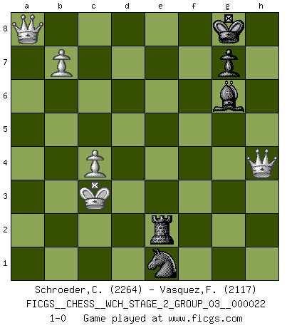 Last move : 1-0 2021 February 6 10:15:26 [Event "FICGS__CHESS__WCH_STAGE_2_GROUP_03__000022"] [Site "FICGS"] [Date "2020.10.07"] [Round "1"] [White "Schroeder,Christoph"] [Black "Vasquez,Fernando"] [Result "1-0"] [WhiteElo "2264"] [BlackElo "2117"] 1.e4 e5 2.Bc4 Nf6 3.d4 exd4 4.Nf3 Nxe4 5.Qxd4 Nf6 6.Nc3 Be7 7.Bg5 O-O 8.O-O-O h6 9.Qh4 hxg5 10.Nxg5 d6 11.Bd3 Re8 12.Rhe1 Bg4 13.Nce4 Bf5 14.Nxd6 Nh7 15.Ndxf7 Bxg5+ 16.Nxg5 Bxd3 17.Rxe8+ Qxe8 18.Nxh7 Bxh7 19.Rd8 Nc6 20.Rxe8+ Rxe8 21.Qc4+ Kh8 22.b3 Bg6 23.f3 Kh7 24.h4 Re1+ 25.Kd2 Re7 26.h5 Bf5 27.Kc1 Be6 28.Qb5 Bc8 29.Qd5 a6 30.g4 Bd7 31.Kb2 Kh8 32.a4 Be6 33.Qg5 Bd7 34.f4 Rf7 35.Qd5 Be8 36.Qe6 Re7 37.Qc8 Nb4 38.Qxb7 a5 39.Qf3 c6 40.g5 Nd5 41.g6 Bd7 42.Qf2 Bg4 43.f5 Bxh5 44.Qc5 Re8 45.Qxc6 Nf6 46.Qc7 Ra8 47.Qb7 Re8 48.Qa7 Re5 49.Qc7 Re8 50.Qxa5 Bf3 51.Qc5 Bb7 52.a5 Rc8 53.Qe5 Bd5 54.a6 Be4 55.c4 Re8 56.Qc5 Ra8 57.b4 Ng4 58.b5 Re8 59.a7 Ne5 60.Qd4 Nd3+ 61.Ka3 Bxf5 62.b6 Ne1 63.Qh4+ Kg8 64.b7 Re3+ 65.Kb2 Re2+ 66.Kc3 Bxg6 67.a8Q+ 1-0 Follow this game move after move (download)You need not play well - just help your opponent to play badly. (Genrikh Chepukaitis) Die FIDE ist dabei in die Hände der russischen Mafia zu fallen. (Larry Evans) Por esta medida (el intervalo entre Fischer y sus contemporaneos), yo le considero el mas grande campeón mundial. (Garry Kasparov) Les sacrifices démontrent seulement que quelqu'un a gaffé. (Savielly Tartacover) Rules and bones are meant to be broken. (Anonymous)