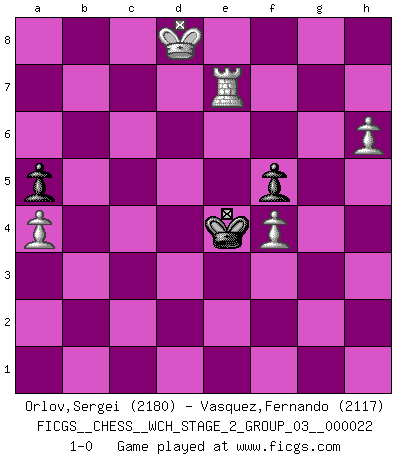 Last move : 1-0 2021 February 6 10:14:47 [Event "FICGS__CHESS__WCH_STAGE_2_GROUP_03__000022"] [Site "FICGS"] [Date "2020.10.07"] [Round "1"] [White "Orlov,Vladimir"] [Black "Vasquez,Fernando"] [Result "1-0"] [WhiteElo "2180"] [BlackElo "2117"] 1.e4 e5 2.Nf3 Nf6 3.Nxe5 d6 4.Nf3 Nxe4 5.d4 d5 6.Bd3 Nc6 7.O-O Be7 8.c4 Nb4 9.Be2 O-O 10.Nc3 Be6 11.Ne5 c5 12.Nxe4 dxe4 13.d5 Bc8 14.a3 Na6 15.Qc2 f6 16.Ng4 f5 17.Ne5 Nb8 18.b4 Qc7 19.Bb2 Nd7 20.Nxd7 Bxd7 21.Kh1 Bd6 22.Qc3 Rf6 23.bxc5 Bxc5 24.f4 Rc8 25.a4 a5 26.g3 Qb6 27.Qd2 Rg6 28.Bc3 Be3 29.Qe1 Ra8 30.Kg2 Bc5 31.Qd2 Qc7 32.Be5 Qd8 33.Bd4 Qc7 34.Rfb1 b6 35.Be3 Qd6 36.Bxc5 Qxc5 37.Rb3 Kf8 38.Qb2 Rd6 39.h3 Rb8 40.Qa3 Qxa3 41.R1xa3 Ke8 42.Kf2 Kd8 43.Ke3 Rh6 44.h4 Kc7 45.Kd4 Rf6 46.h5 g6 47.h6 Rd8 48.Rc3 Bc6 49.Ra1 Rfd6 50.g4 Be8 51.Ke5 Kb7 52.Rg1 Kb8 53.gxf5 gxf5 54.Rh3 Rg6 55.Rxg6 Bxg6 56.d6 Kb7 57.c5 bxc5 58.Rb3+ Ka7 59.Bb5 c4 60.Rb1 Bh5 61.d7 Be2 62.Kd6 Bd3 63.Rc1 e3 64.Bxc4 Bxc4 65.Rxc4 e2 66.Rc1 Rb8 67.Re1 Rb2 68.d8Q Rd2+ 69.Ke7 Rxd8 70.Kxd8 Kb6 71.Rxe2 Kc5 72.Re7 Kd5 73.Rxh7 Ke4 74.Re7+ 1-0 Follow this game move after move (download)The defensive power of a pinned piece is only imaginary. (Aaron Nimzovich) Frage: Gibt es etwas was Sie mehr lieben als Autobahnen ohne Tempobegrenzungen? - Antwort: Deutsche Frauen ohne Tempobegrenzungen. (Loek van Wely) Jugadores de primera clase pierden en contra de jugadores de segunda clase porque los jugadores de segunda clase a veces juegan una partida de primer clase. (Siegbert Tarrasch) Les erreurs sont comme les malheurs, elles n'arrivent jamais seules. (Siegbert Tarrasch) Computer Science is no more about computers than astronomy is about telescopes. (Edsger W. Dijkstra)