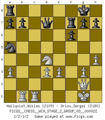 Last move : 1/2-1/2 2020 December 2 22:53:17 [Event "FICGS__CHESS__WCH_STAGE_2_GROUP_03__000022"] [Site "FICGS"] [Date "2020.10.07"] [Round "1"] [White "Hallqvist,Niklas"] [Black "Orlov,Vladimir"] [Result "1/2-1/2"] [WhiteElo "2109"] [BlackElo "2180"] 1.c4 Nf6 2.g3 e5 3.Bg2 d5 4.cxd5 Nxd5 5.Nf3 Nc6 6.O-O Nb6 7.Nc3 Be7 8.d3 O-O 9.a3 Be6 10.b4 Nd4 11.Rb1 f6 12.Be3 c5 13.bxc5 Bxc5 14.Qd2 Nb3 15.Qc2 Bxe3 16.fxe3 Na5 17.Qb2 Nd5 18.Nxd5 Bxd5 19.h4 e4 20.Nd4 exd3 21.exd3 Bxg2 22.Qxg2 Rf7 23.Rfc1 Qd7 1/2-1/2 Follow this game move after move (download)Life is like a game of Chess, changing with each move. (Chinese proverb) Heutzutage gewinnt im Turnier nicht derjenige Spieler, der weitreichende Pläne entwirft, sondern einfach jener, der Zug um Zug kämpft. (David Bronstein) Fischer es el jugador mas fuerte del mundo. De hecho, el jugador mas fuerte que jamas haya existido. (Larry Evans) Même si vous avez un bon coup à faire, regardez toujours s'il n'y en a pas un qui lui soit préférable. (Pedro Damiano) The production of too many useful things results in too many useless people. (Karl Marx)