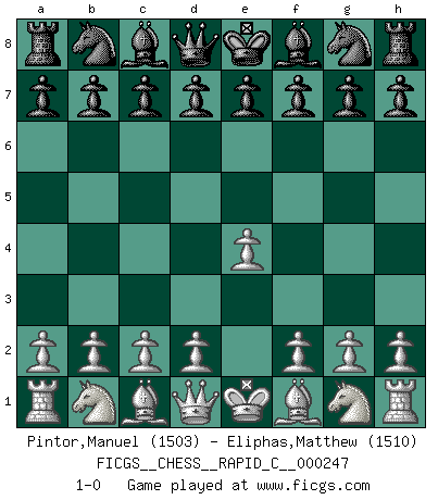 Last move : 1-0 2020 November 7 18:56:58 [Event "FICGS__CHESS__RAPID_C__000247"] [Site "FICGS"] [Date "2020.10.07"] [Round "1"] [White "Pintor,Manuel"] [Black "Eliphas,Matthew"] [Result "1-0"] [WhiteElo "1503"] [BlackElo "1510"] 1.e4 1-0 This chess game has been lost on time (started : 2020.10.07 23:34:44) Follow this game move after move (download)It's just you and your opponent at the board and you're trying to prove something. (Bobby Fischer) Im Leben werden Partien nie so unstrittig gewonnen wie im Spiel (Emanuel Lasker) No es tiempo de jugar al Ajedrez cuando la casa esta en llamas. (Proverbio Italiano) L'ordinateur a tué l'originalité. Il n'y a plus guère d'aventures sur l'échiquier. (Jacob Murray) When you stop learning you start dying. (Scott Adams)
