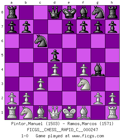Last move : 1-0 2020 November 14 19:0:3 [Event "FICGS__CHESS__RAPID_C__000247"] [Site "FICGS"] [Date "2020.10.07"] [Round "1"] [White "Pintor,Manuel"] [Black "Ramos,Marcos"] [Result "1-0"] [WhiteElo "1503"] [BlackElo "1571"] 1.e4 c6 2.f4 d5 3.exd5 cxd5 4.Nf3 Nc6 5.d4 Bg4 6.c3 1-0 This chess game has been lost on time (started : 2020.10.07 23:34:44) Follow this game move after move (download)Chess books should be used as we use glasses: to assist the sight, although some players make use of them as if they thought they conferred sight. (Jose Raul Capablanca) Alles was am Schachbrett zählt sind gute Züge. (Robert James Fischer) Es muy difícil jugar en contra de la teoría de Einstein. - en su primera derrota en contra de Fischer (Mikhail Tal) 'L'échange des dames est un coup dur pour les deux adversaires...' Un journaliste lors d'une partie du match Spassky-Fischer I fear not the man who has practiced 10,000 kicks once, but I fear the man who has practiced one kick 10,000 times. (Bruce Lee)
