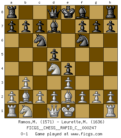 Last move : 0-1 2020 November 15 7:48:7 [Event "FICGS__CHESS__RAPID_C__000247"] [Site "FICGS"] [Date "2020.10.07"] [Round "1"] [White "Ramos,Marcos"] [Black "Leurette,Marc-Antoine"] [Result "0-1"] [WhiteElo "1571"] [BlackElo "1636"] 1.b3 e5 2.Bb2 Nc6 3.e3 d5 4.Nf3 e4 5.Nd4 Bd7 6.Be2 Nf6 0-1 This chess game has been lost on time (started : 2020.10.07 23:34:44) Follow this game move after move (download)Chess opens and enriches your mind. (Saudin Robovic) Zeige mir drei Eröffnungsvarianten und ich beweise dir, dass zwei davon inkorrekt sind. (Emanuel Lasker) Aunque la mayoría de la gente disfruta observar las partidas de los grandes Maestros de ataque, algunos de los jugadores mas notables en la historia han sido los jugadores silenciosos posicionales. Lentamente ellos te aplastan despojandote de tu espacio, congestionando tus piezas y dejandote virtualmente sin nada que hacer. (Yasser Seirawan) Il n'y a plus de joueurs du niveau de Jacob Murray dont la seule quête est le beau jeu, le plaisir de voir les pièces construire quelque chose. Sur 10 idées à la minute, 9 seront sans intérêt, la dernière s'avèrera géniale. (Christian Bauer) It is not true that people stop pursuing dreams because they grow old, they grow old because they stop pursuing dreams. (Gabriel Garcia Marquez)