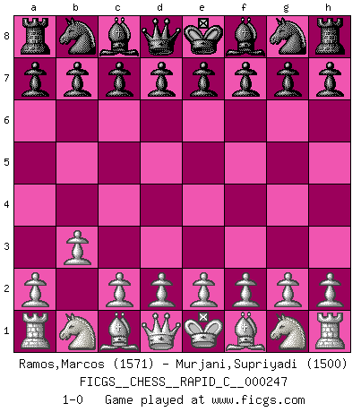 Last move : 1-0 2020 November 7 5:55:3 [Event "FICGS__CHESS__RAPID_C__000247"] [Site "FICGS"] [Date "2020.10.07"] [Round "1"] [White "Ramos,Marcos"] [Black "Murjani,Supriyadi"] [Result "1-0"] [WhiteElo "1571"] [BlackElo "1500"] 1.b3 1-0 This chess game has been lost on time (started : 2020.10.07 23:34:44) Follow this game move after move (download)I don't believe in psychology. I believe in good moves. (Bobby Fischer) Es liegt in der Natur, vernüftig zu denken und unlogisch zu handeln. (Anatole France) Si yo gano un torneo, yo lo gano por mí mismo. Yo hago las jugadas. Nadie me ayuda. (Bobby Fischer) Donnez-moi un Cavalier en 6e et je gagnerais toutes mes parties. (Steinitz) He who defends everything defends nothing. (Frederick the Great)