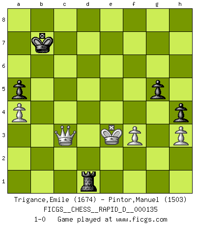Last move : 1-0 2020 November 4 16:56:30 [Event "FICGS__CHESS__RAPID_D__000135"] [Site "FICGS"] [Date "2020.10.07"] [Round "1"] [White "Trigance,Emile"] [Black "Pintor,Manuel"] [Result "1-0"] [WhiteElo "1674"] [BlackElo "1503"] 1.Nf3 Nc6 2.c4 d5 3.d4 Nf6 4.Nc3 Bg4 5.cxd5 Nxd5 6.e4 Nxc3 7.bxc3 e6 8.Bb5 Qd6 9.Qa4 Bxf3 10.gxf3 a6 11.Rb1 Be7 12.Bxc6+ Qxc6 13.Qxc6+ bxc6 14.Rb7 Kd7 15.Bf4 Bd6 16.Bxd6 Kxd6 17.Kd2 Rhb8 18.Rhb1 Rxb7 19.Rxb7 a5 20.Kd3 f6 21.f4 h5 22.c4 h4 23.a4 g5 24.fxg5 fxg5 25.h3 Rf8 26.Ke3 Ra8 27.f3 Kd7 28.e5 Kc8 29.Rb2 Kd7 30.Ke4 Ke7 31.Rb7 Kd7 32.d5 cxd5+ 33.cxd5 exd5+ 34.Kxd5 Ra6 35.e6+ Kc8 36.Rb8+ Kxb8 37.e7 Rd6+ 38.Ke5 Rd3 39.e8Q+ Ka7 40.Qc6 Re3+ 41.Kd4 Re1 42.Qxc7+ Ka6 43.Qc4+ Kb7 44.Qc3 Rd1+ 45.Ke3 1-0 Follow this game move after move (download)Castle early and often. (Rob Sillars) Sie bekommen vielleicht den Eindruck, dass die Spitzenspieler überhaupt gar nicht so stark sind. Aber das stimmt nicht. Es ist eine Illusion. Mit einem Computer an der Seite ist es sehr leicht, Urteile zu fällen, aber wenn man alleine am Brett sitzt, sieht die Sache ganz anders aus. (Vladimir Kramnik) Debió haber existido una vez en que los hombres eran semidióses, de otra manera no hubiesen podido inventar el Ajedrez. (Gustav Schenk) 'L'échange des dames est un coup dur pour les deux adversaires...' Un journaliste lors d'une partie du match Spassky-Fischer It's not the size of the dog in the fight, it's the size of the fight in the dog. (Mark Twain)