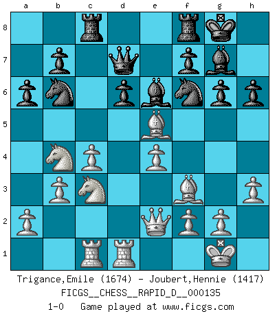 Last move : 1-0 2020 November 10 12:22:8 [Event "FICGS__CHESS__RAPID_D__000135"] [Site "FICGS"] [Date "2020.10.07"] [Round "1"] [White "Trigance,Emile"] [Black "Joubert,Hennie"] [Result "1-0"] [WhiteElo "1674"] [BlackElo "1417"] 1.Nf3 Nf6 2.c4 g6 3.d4 Bg7 4.Nc3 O-O 5.Bg5 d6 6.e3 Nbd7 7.h3 c5 8.Be2 h6 9.Bf4 Nh5 10.Bh2 cxd4 11.Nxd4 Nhf6 12.O-O Nb6 13.Rc1 a6 14.b3 Bd7 15.Bf3 Rb8 16.Qe2 e5 17.Nc2 Be6 18.e4 Rc8 19.Rfd1 Qc7 20.Nb4 Qd7 21.Bxe5 1-0 Follow this game move after move (download)The older I grow, the more I value Pawns. (Keres) Die jungen Leute sollen verstehen, dass sie noch etwas von mir lernen können und müssen. (Viktor Kortschnoi) En manos de Fischer's, una diminuta ventaja teórica es tan buena como tener una Reina de ventaja. (Isaac Kashdan) Vous n'êtes pas toujours obligé de jouer le meilleur coup. Un coup doit être actif, entreprenant, correct et beau ! (David Bronstein) When you've done things right people won't know you've done anything at all. (Futurama)