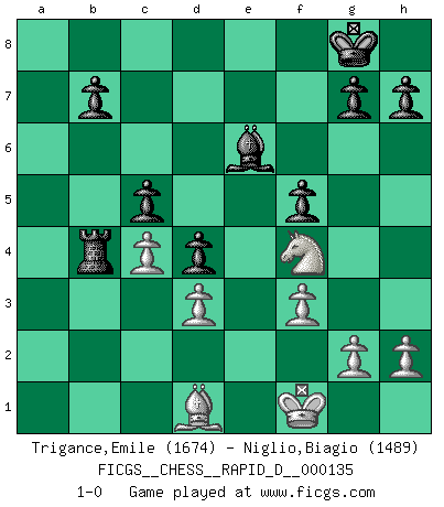 Last move : 1-0 2021 January 7 16:10:36 [Event "FICGS__CHESS__RAPID_D__000135"] [Site "FICGS"] [Date "2020.10.07"] [Round "1"] [White "Trigance,Emile"] [Black "Niglio,Biagio"] [Result "1-0"] [WhiteElo "1674"] [BlackElo "1489"] 1.Nf3 d5 2.c4 d4 3.e3 Nc6 4.exd4 Nxd4 5.Nxd4 Qxd4 6.Nc3 c6 7.d3 Nh6 8.Be3 Qd8 9.f3 Nf5 10.Bf2 e5 11.Be2 Bd6 12.O-O O-O 13.Ne4 Bc7 14.Ng3 Nd4 15.Re1 Ba5 16.Rf1 Be6 17.a3 f5 18.b4 Bc7 19.Re1 a5 20.Qb1 axb4 21.axb4 Rxa1 22.Qxa1 Nc2 23.Qb2 Nxe1 24.Bxe1 Qd4+ 25.Qxd4 exd4 26.Bf2 Rd8 27.Kf1 Be5 28.Nh5 Ra8 29.Bg3 Bxg3 30.Nxg3 Ra4 31.Bd1 Rxb4 32.Ne2 c5 33.Nf4 1-0 This chess game has been lost on time (started : 2020.10.07 23:40:0) Follow this game move after move (download)Chess is imagination. (David Bronstein) Ich weiss nicht was Gott gegen mich auf 1.e4 antworten würde. (Robert James Fischer) Debió haber existido una vez en que los hombres eran semidióses, de otra manera no hubiesen podido inventar el Ajedrez. (Gustav Schenk) La vie et les Echecs sont tous les deux une lutte constante. (Lasker) I think your argument is specious - I think your tie is ugly. (Gregory House to Dr. Foreman, House M.D.)