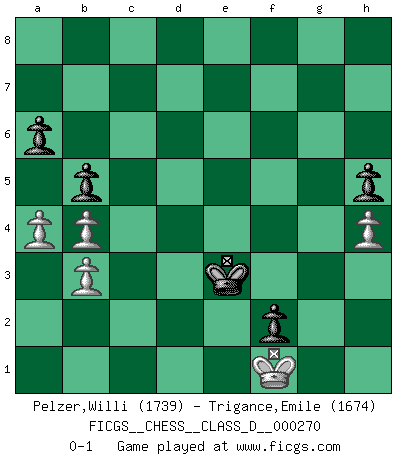 Last move : 0-1 2020 November 8 1:34:42 [Event "FICGS__CHESS__CLASS_D__000270"] [Site "FICGS"] [Date "2020.10.10"] [Round "1"] [White "Pelzer,Willi"] [Black "Trigance,Emile"] [Result "0-1"] [WhiteElo "1739"] [BlackElo "1674"] 1.e4 Nc6 2.Nf3 e5 3.Bb5 Nf6 4.O-O d6 5.d3 Be7 6.Nc3 Bd7 7.h3 h6 8.Re1 O-O 9.Be3 a6 10.Bc4 Na5 11.Bb3 Nxb3 12.cxb3 c5 13.Nd2 b5 14.f4 exf4 15.Bxf4 Qb6 16.Qe2 Be6 17.Be3 Rfe8 18.Qf2 Qc6 19.Ne2 d5 20.Rac1 dxe4 21.Nd4 Qd5 22.Nxe6 Qxe6 23.Bxc5 Bxc5 24.Rxc5 e3 25.Qf3 Ra7 26.Nf1 e2 27.Ng3 Qe3+ 28.Qxe3 Rxe3 29.Rc8+ Kh7 30.Kf2 Rxd3 31.Rxe2 Rd5 32.b4 Rad7 33.Rc6 R5d6 34.Rxd6 Rxd6 35.Kf3 Kg8 36.Ne4 Nxe4 37.Kxe4 Re6+ 38.Kd3 Kf8 39.Rc2 Rd6+ 40.Ke4 Ke7 41.b3 Re6+ 42.Kd5 Kd7 43.a4 Rd6+ 44.Ke4 Re6+ 45.Kd3 Rd6+ 46.Ke2 Rd4 47.Rd2 Rxd2+ 48.Kxd2 Kd6 49.Kd3 Kd5 50.Kc3 f5 51.g3 g5 52.Kd3 f4 53.gxf4 gxf4 54.h4 h5 55.Ke2 Ke4 56.Ke1 Kf3 57.Kf1 Ke3 58.Ke1 f3 59.Kf1 f2 0-1 Follow this game move after move (download)Is Bobby Fischer quite sane ? (Salo Flohr) Im Spitzenschach von heute geht es nur um Vorbereitung, um tiefgründige, sorgfältige Eröffnungsvorbereitung. (Nigel Short) Una mala movida nulifica cuarenta buenas. (Horowitz) Shah mat. Le roi est mort. Cri de fierté d'un joueur venant de terrasser son adversaire, courtoisement, sans effusion de sang. Are you threatening me, Master Jedi ? (Chancellor Palpatine in Star Wars ep.3)