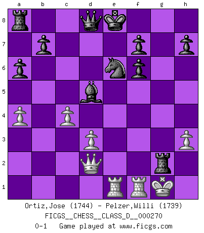 Last move : 0-1 2020 October 24 19:13:43 [Event "FICGS__CHESS__CLASS_D__000270"] [Site "FICGS"] [Date "2020.10.10"] [Round "1"] [White "Ortiz,Jose"] [Black "Pelzer,Willi"] [Result "0-1"] [WhiteElo "1744"] [BlackElo "1739"] 1.e4 e5 2.Bc4 Nf6 3.Nc3 c6 4.a4 a6 5.Nf3 d5 6.exd5 cxd5 7.Bb3 Bg4 8.d3 Nc6 9.h3 Bh5 10.Bg5 Bb4 11.O-O Bxc3 12.bxc3 d4 13.Qd2 Bxf3 14.cxd4 Nxd4 15.Bc4 Bd5 16.f4 Bxc4 17.fxe5 Ne6 18.exf6 Nxg5 19.Rae1+ Ne6 20.Re4 Bd5 21.Re5 gxf6 22.R5e1 Rg8 23.c4 Rxg2+ 0-1 Bishop's Opening : Berlin defense Kingside Castling by player White (move 11) Player Black won this chess game. Follow this game move after move (download)Who is your opponent tonight, tonight I am playing against the Black pieces. (Akiba Rubinstein) Ich habe Putins Aufstieg an die Macht beobachtet und seine Politik, die demokratischen Institutionen meines Landes zu zerstören. (Garry Kasparov) El Ajedrez expande y enriquece tu mente. (Saudin Robovic) Avec des compensations pour le matériel en plus... (Anonyme) We need strong personalities and only one world champion to attract sponsors. (Anatoly Karpov)