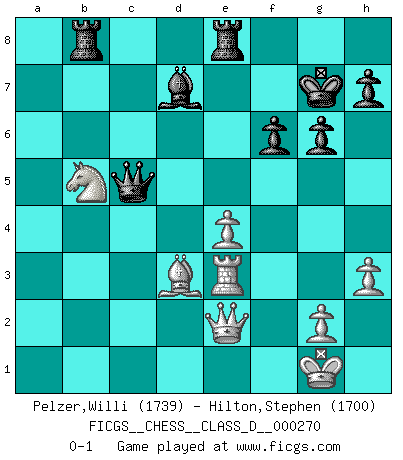 Last move : 0-1 2021 February 26 23:31:59 [Event "FICGS__CHESS__CLASS_D__000270"] [Site "FICGS"] [Date "2020.10.10"] [Round "1"] [White "Pelzer,Willi"] [Black "Hilton,Stephen"] [Result "0-1"] [WhiteElo "1739"] [BlackElo "1700"] 1.d4 Nf6 2.c4 c5 3.d5 e6 4.Nc3 exd5 5.cxd5 d6 6.e4 g6 7.Nf3 Bg7 8.Bf4 a6 9.h3 O-O 10.Nd2 Re8 11.Bd3 b5 12.O-O Qb6 13.Be3 Qc7 14.Re1 Bb7 15.a3 Nbd7 16.Rc1 Ne5 17.Bf1 c4 18.Qc2 Ned7 19.f3 Nc5 20.Bf2 Nfd7 21.Ne2 Ne5 22.Nf4 Bh6 23.Be3 Bxf4 24.Bxf4 Ned3 25.Bh6 Nxe1 26.Rxe1 Qe7 27.Qc3 f6 28.Be3 Nd7 29.Bd4 Bxd5 30.Re3 Bb7 31.b3 cxb3 32.Qxb3+ Qf7 33.Qb4 d5 34.Bd3 dxe4 35.fxe4 Ne5 36.Bxe5 Rxe5 37.a4 Bc6 38.Nf3 R5e8 39.Nd4 Bd7 40.axb5 axb5 41.Nxb5 Rab8 42.Qa4 Qe7 43.Qa2+ Kg7 44.Qe2 Qc5 0-1 This chess game has been lost on time (started : 2020.10.10 19:25:6) Follow this game move after move (download)Chess teaches you to control the initial excitement you feel when you see something that looks good and it trains you to think objectively when you're in trouble. (Stanley Kubrick) Capablanka war das größte Genie der Schachgeschichte! Aber denken sie nicht er habe nichts vom Schach verstanden. Er wusste nur soviel wie er wissen musste um seine Ziele zu erreichen. (Mikhail Moiseyevich Botvinik) En el Ajedrez, cuando menos, el valiente hereda la tierra. (Edmar Mednis) Une platitude souvent récitée à propos des Echecs est qu'une des choses les plus difficiles à réaliser est de gagner une position gagnante. Cela ne manque pas de sens mais, pour ma part, j'ai toujours trouvé plus difficile de gagner une position perdante. (Tim Krabbe) It is a good thing for an uneducated man to read books of quotations. (Winston Churchill)