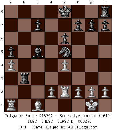 Last move : 0-1 2020 November 4 10:38:25 [Event "FICGS__CHESS__CLASS_D__000270"] [Site "FICGS"] [Date "2020.10.10"] [Round "1"] [White "Trigance,Emile"] [Black "Soretti,Vincenzo"] [Result "0-1"] [WhiteElo "1674"] [BlackElo "1611"] 1.Nf3 d5 2.c4 Nf6 3.cxd5 Nxd5 4.e4 Nb4 5.Qa4+ N8c6 6.a3 Nd3+ 7.Bxd3 Qxd3 8.Ne5 b5 9.Nxd3 bxa4 10.Nc5 e6 11.b4 axb3 12.Nxb3 Rb8 13.Nc3 Rxb3 14.O-O Bc5 15.Ne2 Ba6 16.Re1 Bxe2 17.Rxe2 Ne5 18.a4 a5 0-1 Follow this game move after move (download)One doesn't have to play well, it's enough to play better than your opponent. (Siegbert Tarrasch) Den Ruhm habe ich schon, jetzt brauche ich noch das Geld. (Wilhelm Steinitz) El Ajedrez es realmente noventa y nueve por ciento calculación. (Soltis) La conception d'un plan est le processus par lequel un joueur exploite les avantages de sa position tout en s'efforçant d'en réduire au minimum les inconvénients. Afin de garantir le succès, un plan doit toujours se fonder sur un diagnostic objectif des particularités d'une position. La conception d'un plan est d'autant plus difficile que la position est équilibrée, et grandement facilitée lorsqu'il n'existe qu'un seul plan susceptible de répondre aux exigences de la position. (Harry Golombek) The question of whether computers can think is just like question of whether submarines can swim. (Edsger W. Dijkstra)