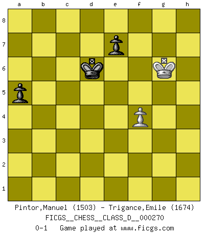 Last move : 0-1 2020 November 13 12:25:15 [Event "FICGS__CHESS__CLASS_D__000270"] [Site "FICGS"] [Date "2020.10.10"] [Round "1"] [White "Pintor,Manuel"] [Black "Trigance,Emile"] [Result "0-1"] [WhiteElo "1503"] [BlackElo "1674"] 1.e4 Nc6 2.f4 d5 3.exd5 Qxd5 4.Nc3 Qd8 5.Nf3 g6 6.d4 Bf5 7.Bc4 Na5 8.Bb5+ c6 9.Ba4 b5 10.Bb3 Nxb3 11.axb3 Bg7 12.O-O Nh6 13.Ne5 Qc7 14.h3 f6 15.Nd3 Nf7 16.Nc5 Qc8 17.Qf3 O-O 18.g4 Bd7 19.Be3 Nd8 20.Nxd7 Qxd7 21.h4 f5 22.gxf5 Qxf5 23.Ne4 Ne6 24.c3 Qd5 25.b4 Bh6 26.Ng5 Qxf3 27.Rxf3 Bxg5 28.hxg5 Nxg5 29.Rg3 Ne6 30.Rf1 Rf5 31.Rg4 Raf8 32.Kg2 Nc7 33.Rg5 Nd5 34.Bd2 Kg7 35.Rxf5 Rxf5 36.Kg3 Nf6 37.Re1 Kf7 38.Kf3 Nd5 39.Ke4 Nc7 40.Ra1 a6 41.b3 h5 42.Rg1 Kf6 43.c4 h4 44.Rh1 Rh5 45.Bc3 Ke6 46.Be1 h3 47.Bg3 Kd7 48.Kf3 Ne6 49.Bf2 Kc8 50.Kg4 h2 51.Be3 Ng7 52.Bf2 Nf5 53.Kf3 Kd7 54.Ke4 Nd6+ 55.Kd3 Rh3+ 56.Ke2 bxc4 57.bxc4 Nxc4 58.Kf1 Nd2+ 59.Kg2 Ne4 60.Kxh3 Nxf2+ 61.Kxh2 Nxh1 62.Kxh1 Ke6 63.Kg2 Kd5 64.Kf3 Kxd4 65.Kg4 c5 66.bxc5 Kxc5 67.Kg5 Kd6 68.Kxg6 a5 0-1 Follow this game move after move (download)Fischer is an American Chess tragedy on par with Morphy and Pillsbury. (Mig Greengard) Fischer machte Schach einfach zu einer aufregenden Sache, wann immer er sich ans Brett setzte. (Raymond Keene) Entre mas años cumplo, mas valoro los Peones. (Keres) Il a essayé de se convaincre qu'il pourrait empêcher toutes les erreurs et ne jamais perdre. L'horreur ! Gary Kasparov au sujet de Robert Fischer. Tree pose grows confidence. It roots me to this world. (Terri Guillemets)