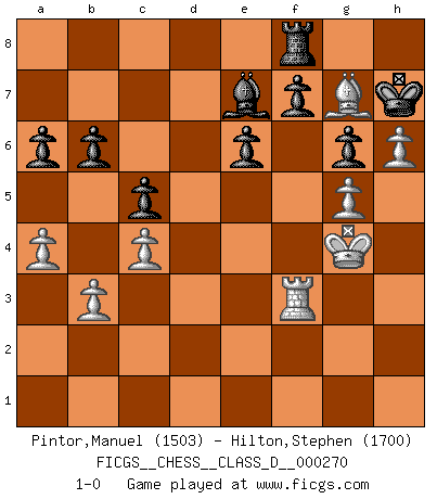 Last move : 1-0 2020 November 14 13:51:1 [Event "FICGS__CHESS__CLASS_D__000270"] [Site "FICGS"] [Date "2020.10.10"] [Round "1"] [White "Pintor,Manuel"] [Black "Hilton,Stephen"] [Result "1-0"] [WhiteElo "1503"] [BlackElo "1700"] 1.e4 c5 2.f4 d5 3.exd5 Qxd5 4.Nc3 Qd8 5.Bc4 e6 6.Nf3 Nf6 7.d3 Be7 8.O-O O-O 9.Ng5 h6 10.Nge4 Nc6 11.g4 a6 12.a4 b6 13.g5 hxg5 14.fxg5 Nd5 15.h4 Nxc3 16.bxc3 Ne5 17.Bb3 Bb7 18.Bf4 Nc6 19.Qg4 Na5 20.Rad1 Nxb3 21.cxb3 Qd5 22.c4 Qd4+ 23.Kh2 Bxe4 24.dxe4 Qxe4 25.Kh3 Rfd8 26.h5 Rd3+ 27.Rxd3 Qxd3+ 28.Rf3 Qf5 29.h6 Qxg4+ 30.Kxg4 Rd8 31.Be5 g6 32.Kf4 Kh7 33.Kg4 Rf8 34.Bg7 1-0 Follow this game move after move (download)The Pin is mightier than the sword. (Fred Reinfeld) Schach ist das schnellste Spiel der Welt, weil man in jeder Sekunde Tausende von Gedanken ordnen muß. (Albert Einstein) Muchos se han convertido en Maestros de Ajedrez, nadie se ha convertido en el Maestro del Ajedrez. (Siegbert Tarrasch) La vie et les Echecs sont tous les deux une lutte constante. (Lasker) The message for business people contemplating their place in the cyberspace is simple and direct: get linked or get lost. (Vic Sussman and Kenan Pollack)