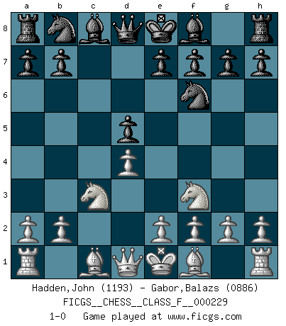 Last move : 1-0 2020 November 24 18:54:5 [Event "FICGS__CHESS__CLASS_F__000229"] [Site "FICGS"] [Date "2020.10.13"] [Round "1"] [White "Hadden,John"] [Black "Gabor,Balazs"] [Result "1-0"] [WhiteElo "1193"] [BlackElo "0886"] 1.d4 d5 2.c4 c6 3.Nf3 Nf6 4.cxd5 cxd5 5.Nc3 1-0 This chess game has been lost on time (started : 2020.10.13 16:35:30) Follow this game move after move (download)Strategy requires thought, tactics require observation. (Max Euwe) Irgendwie scheint mir sonntags früh um 9 Uhr der Killerinstinkt verloren gegangen zu sein. (Alexej Shirov) El Ajedrez es en su esencia, un juego. En su forma, un arte. Y en su ejecución, una ciencia. (Baron Tassilo) Les pièces de l'échiquier étaient impitoyables. Elles le retenaient, elles l'absorbaient. Il y avait de l'horreur en cela, mais aussi une harmonie unique. Car, qu'y a-t-il dans le monde, à part les échecs ? (V. Nabokov) If everyone is thinking alike, then somebody isn't thinking. (US General George S. Patton)