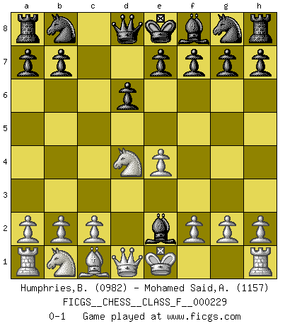 Last move : 0-1 2020 November 28 16:52:3 [Event "FICGS__CHESS__CLASS_F__000229"] [Site "FICGS"] [Date "2020.10.13"] [Round "1"] [White "Humphries,Billy"] [Black "Mohamed Said,Azaim"] [Result "0-1"] [WhiteElo "0982"] [BlackElo "1157"] 1.e4 c5 2.Nf3 d6 3.d4 Bg4 4.Be2 cxd4 5.Nxd4 Bxe2 0-1 This chess game has been lost on time (started : 2020.10.13 16:35:30) Follow this game move after move (download)Up to this point White has been following well-known analysis. But now he makes a fatal error: he begins to use his own head. (Siegbert Tarrasch) Unter Putin wird alles Geld aus Russland wie von einem Staubsauger nach Moskau umgeleitet, das ist wie ein schwarzes Loch. (Garry Kasparov) El Ajedrez es una manera fabulosa para que los niños aprendan a autovalorarse y a autoestimarse. (Saudin Robovic) Les Cavaliers se révèlent fort utiles dans les positions fermées. D'habitude, les Fous sont un peu plus forts que les Cavaliers dans les positions ouvertes. Qu'on le veuille ou non, il restera toujours des exceptions ! No, no, you're not thinking; you're just being logical. (Niels Bohr)