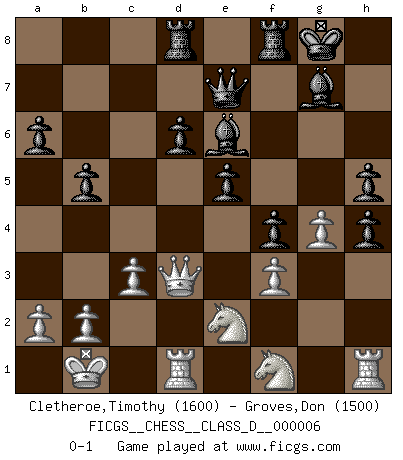 Last move : 0-1 2006 September 2 7:12:29 [Event "FICGS__CHESS__CLASS_D__000006"] [Site "FICGS"] [Date "2006.06.22"] [Round "1"] [White "Cletheroe,Timothy"] [Black "Groves,Don"] [Result "0-1"] [WhiteElo "1600"] [BlackElo "1500"] 1.Nc3 g6 2.e4 Bg7 3.d4 d6 4.Bc4 a6 5.Qf3 e6 6.Be3 b5 7.Bd3 Ne7 8.Nge2 Bb7 9.Ng3 Nd7 10.Nce2 c5 11.c3 cxd4 12.Bxd4 e5 13.Be3 f5 14.Bg5 O-O 15.Bc2 h6 16.Bxe7 Qxe7 17.Qd3 Nc5 18.Qd2 f4 19.Nf1 Nxe4 20.Bxe4 Bxe4 21.f3 Bf5 22.O-O-O Rad8 23.g4 Be6 24.Kb1 g5 25.h4 gxh4 26.Qd3 h5 0-1 Dunst (Sleipner, Heinrichsen) Opening Kingside Castling by player Black (move 14) Queenside Castling by player White (move 22) Player Black won this chess game. Follow this game move after move (download)I give 98 percent of my mental energy to Chess. Others give only 2 percent. (Bobby Fischer) Sie führen leise Selbstgespräche, schlürfen lautstark ihre Getränke, schmatzen hörbar beim Essen, blasen ihrem Gegenüber Rauch in die Augen, niesen ihm ins Gesicht, starren ihn unverwandt an, bis er sich unter ihren Blicken windet, rutschen ständig auf ihrem Stuhl hin und her, rülpsen und bohren in der Nase. (Anonymous) El Jaque al descubierto es el bombardero del tablero. (Reuben Fine) Plusieurs personnes se sont demandées comment Tal faisait pour gagner... En fait, c'est très simple ! Il met ses pièces au centre de l'échiquier et les sacrifie quelque part ! (David Bronstein) Chess, like love, like music, has the power to make people happy. (Siegbert Tarrasch)