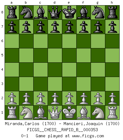 Last move : 0-1 2020 November 15 7:48:7 [Event "FICGS__CHESS__RAPID_B__000353"] [Site "FICGS"] [Date "2020.10.16"] [Round "1"] [White "Miranda,Carlos"] [Black "Mancieri,Joaquin"] [Result "0-1"] [WhiteElo "1700"] [BlackElo "1700"] 0-1 This chess game has been lost on time (started : 2020.10.16 3:10:46) Follow this game move after move (download)Though most people love to look at the games of the great attacking masters, some of the most successful players in history have been the quiet positional players. They slowly grind you down by taking away your space, tying up your pieces, and leaving you with virtually nothing to do ! (Yasser Seirawan) Kein Schachspieler kann gut schlafen. (H. G. Wells) Un Peón pasado aumenta su poder a medida de que el número de piezas en el tablero disminuye. (Capablanca) Les échecs sont un jeu terrible. Si vous n'avez pas le centre, votre adversaire a une position plus libre. Par contre, si vous avez le centre, alors vous avez vraiment quelque chose pour laquelle vous inquiéter ! (Siegbert Tarrasch) The man who strikes first admits that his ideas have given out. (Chinese proverb)