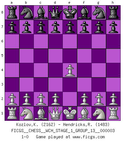 Last move : 1-0 2007 July 18 20:13:24 [Event "FICGS__CHESS__WCH_STAGE_1_GROUP_13__000003"] [Site "FICGS"] [Date "2007.07.11"] [Round "1"] [White "Kozlov,Konstantin"] [Black "Hendricks,Richard"] [Result "1-0"] [WhiteElo "2162"] [BlackElo "1483"] 1.e4 1-0 King's pawn Opening Player White won this chess game. Follow this game move after move (download)Chess is a sea in which a gnat may drink and an elephant may bathe. (Hindu proverb) Alles was ich jemals tun will ist Schach spielen. (Robert James Fischer) No es tiempo de jugar al Ajedrez cuando la casa esta en llamas. (Proverbio Italiano) La solitude du joueur d'Echecs à l'approche du mat est semblable à celle du condamné. (Francis Szpiner) When you've done things right people won't know you've done anything at all. (Futurama)