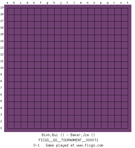 Last move : 0-1 2020 November 15 20:18:45 [Event "FICGS__GO__TOURNAMENT__000071"] [Site "FICGS"] [Date "2020.10.16"] [Round "1"] [Black "Binh,Bui"] [White "Baker,Jim"] [Result "0-1"] 0-1 This go game has been lost on time (started : 2020.10.16 9:35:43) Follow this game move after move (download)More haste less speed. (John Fairbairn) Animated gif is worth one mega-word. (Unknown)