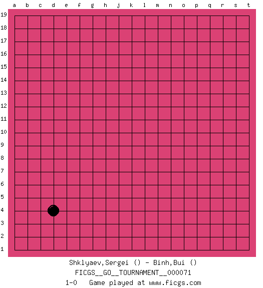 Last move : 1-0 2020 November 15 20:18:45 [Event "FICGS__GO__TOURNAMENT__000071"] [Site "FICGS"] [Date "2020.10.16"] [Round "1"] [Black "Shklyaev,Sergei"] [White "Binh,Bui"] [Result "1-0"] 1.d4 1-0 This go game has been lost on time (started : 2020.10.16 9:35:43) Follow this game move after move (download)In the opening, when you don't know what to play, make a shimari. (Jansteen) Big Chess is a place for big hallucinations. (Thibault de Vassal)