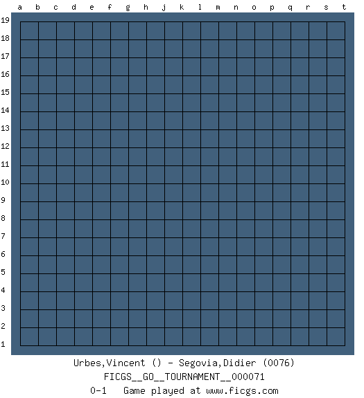 Last move : 0-1 2020 November 15 20:18:45 [Event "FICGS__GO__TOURNAMENT__000071"] [Site "FICGS"] [Date "2020.10.16"] [Round "1"] [Black "Urbes,Vincent"] [White "Segovia,Didier"] [Result "0-1"] [Rating 2 "0076"] 0-1 This go game has been lost on time (started : 2020.10.16 9:35:43) Follow this game move after move (download)The simplest move is the best move. (Anonymous) Some people are so afraid to die that they never begin to live. (Henry Van Dyke)