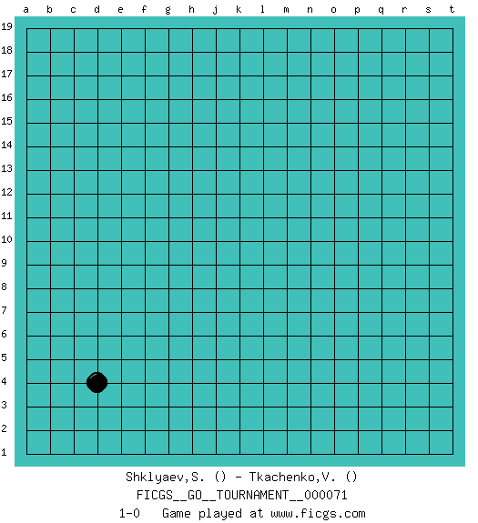Last move : 1-0 2020 November 15 20:18:45 [Event "FICGS__GO__TOURNAMENT__000071"] [Site "FICGS"] [Date "2020.10.16"] [Round "1"] [Black "Shklyaev,Sergei"] [White "Tkachenko,Valentin"] [Result "1-0"] 1.d4 1-0 This go game has been lost on time (started : 2020.10.16 9:35:43) Follow this game move after move (download)If your stone is capped, play the knight's move. (Anonymous) The next best thing to gambling and winning is gambling and loosing. (Nick Dandalos)