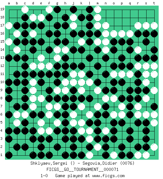Last move : 1-0 2021 March 15 23:26:48 [Event "FICGS__GO__TOURNAMENT__000071"] [Site "FICGS"] [Date "2020.10.16"] [Round "1"] [Black "Shklyaev,Sergei"] [White "Segovia,Didier"] [Result "1-0"] [Rating 2 "0076"] 1.d4 q16 2.c16 k10 3.q4 d10 4.q14 q13 5.r11 r14 6.q15 r15 7.o15 p14 8.p15 p16 9.r8 n15 10.o14 o16 11.p13 p12 12.o12 p11 13.e17 d15 14.c8 e8 15.d6 d7 16.c7 c6 17.c5 b5 18.b4 b6 19.h17 d8 20.c9 d9 21.b11 c11 22.b10 b9 23.e6 k4 24.h3 l3 25.q6 p3 26.q3 q2 27.r2 r3 28.p2 r1 29.q1 s1 30.s2 t2 31.c15 q10 32.r10 k17 33.m12 m15 34.q12 r12 35.r13 s12 36.s13 t12 37.r16 r17 38.d14 d16 39.d17 c17 40.e15 e16 41.f16 g16 42.g17 f15 43.g15 h16 44.f14 j17 45.s16 s17 46.s15 s14 47.t14 t17 48.c13 b12 49.c12 d12 50.h18 j18 51.n9 q5 52.o4 p4 53.o3 r6 54.r5 r7 55.s5 s8 56.s9 r9 57.q9 n5 58.p5 o6 59.q7 p7 60.h5 j5 61.h6 j6 62.h7 h4 63.g4 g5 64.j7 k7 65.e11 j8 66.d11 e12 67.f11 f12 68.f9 f10 69.g10 g11 70.e10 g9 71.h11 h12 72.g8 g7 73.h8 h9 74.c10 h10 75.g12 g13 76.g11 j11 77.k8 k9 78.l8 p9 79.j9 j10 80.k12 l12 81.j12 k13 82.l11 m11 83.n11 o11 84.p8 o8 85.q8 t9 86.o9 o10 87.h13 j13 88.n7 m13 89.m10 n10 90.m6 f4 91.j4 j3 92.h4 g3 93.m4 n4 94.m3 n3 95.m5 m2 96.j2 k2 97.k3 j1 98.j3 h2 99.g2 f2 100.h1 l4 101.n2 n14 102.j14 h14 103.h12 k11 104.l13 l14 105.k14 k15 106.j16 j15 107.h15 h16 108.n13 n16 109.g16 g14 110.k16 l16 111.l15 k15 112.l17 m17 113.l18 m18 114.k18 m19 115.j19 d18 116.b17 b16 117.l19 e18 118.c18 c19 119.f18 f19 120.g19 j17 121.t16 s10 122.r9 q11 123.p10 l6 124.k1 l1 125.n1 d3 126.e3 e4 127.e2 d2 128.f3 e1 129.f1 j1 130.l5 k5 131.k1 m7 132.n6 n8 133.o5 p6 134.j1 r4 135.s3 s6 136.t7 t6 137.m14 p11 138.l15 e13 139.m16 n17 140.l16 b14 141.b15 a15 142.b13 a12 143.a13 a11 144.a10 b8 145.b7 a7 146.a9 a8 147.a4 c3 148.b2 b3 149.c4 e5 150.g6 f7 151.f8 f6 152.a6 a7 153.a8 o11 154.p12 q11 155.o10 o1 156.p1 m9 157.j8 l10 158.l2 n4 159.n3 s11 160.t13 r14 161.s4 t5 162.t10 t11 163.c11 d16 164.d15 j18 165.c17 a17 166.d1 c1 167.e1 a2 168.a3 b1 169.c2 c3 170.a1 b3 171.d3 1-0 Follow this game move after move (download)Play slow, win slow; play fast, lose fast. (Anonymous) There are two major products that came out of Berkeley: LSD and UNIX. We do not believe this is to be a coincidence. (Jeremy S. Anderson)
