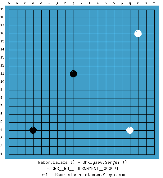 Last move : 0-1 2020 November 18 1:0:15 [Event "FICGS__GO__TOURNAMENT__000071"] [Site "FICGS"] [Date "2020.10.16"] [Round "1"] [Black "Gabor,Balazs"] [White "Shklyaev,Sergei"] [Result "0-1"] 1.d4 r16 2.j11 q4 0-1 This go game has been lost on time (started : 2020.10.16 9:35:43) Follow this game move after move (download)Go is not a blocking game, it's a game of action. (Pierre Audouard) Who needs drugs and alcohol if he can play Big Chess at FICGS ? (Heinz-Georg Lehnhoff)