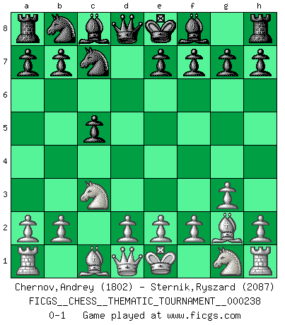 Last move : 0-1 2020 November 26 0:4:5 [Event "FICGS__CHESS__THEMATIC_TOURNAMENT__000238"] [Site "FICGS"] [Date "2020.10.16"] [Round "1"] [White "Chernov,Andrey"] [Black "Sternik,Ryszard"] [Result "0-1"] [WhiteElo "1802"] [BlackElo "2087"] 1.c4 Nf6 2.Nc3 c5 3.g3 d5 4.cxd5 Nxd5 5.Bg2 Nc7 0-1 This chess game has been lost on time (started : 2020.10.16 13:42:29) Follow this game move after move (download)There are two classes of men; those who are content to yield to circumstances and who play whist; those who aim to control circumstances, and who play Chess. (Mortimer Collins) Was ist der Unterschied zwischen einem Strassenarbeiter und einem Schachspieler? --Der Schachspieler bewegt sich ab und zu. (Anonymous) Un juego de Ajedrez es un dialogo, una conversación entre un jugador y su oponente. Cada movimiento del oponente puede contener amenazas o tropiezos, pero un jugador no se puede defender de las amenazas o tomar ventaja de los tropiezos si es que no se pregunta a sí mismo: ¿Que es lo que mi oponente va a hacer después de cada movida?. (Bruce A. Moon) Soyez une menace à chaque fois que vous vous asseyez pour jouer. (Ken Smith) Vladimir Ras-Putin is still alive... He is also a good actor, I saw him in the Lord of the Rings. (Rodolfo d'Ettorre)