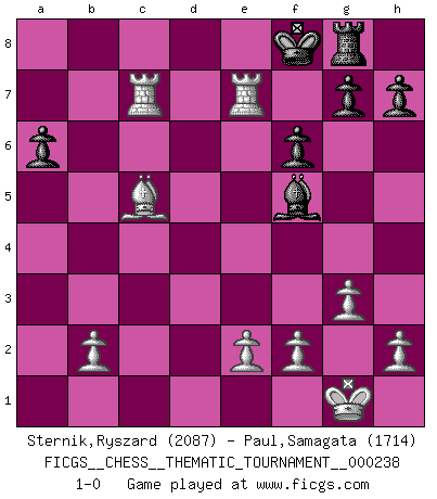Last move : 1-0 2020 November 11 3:6:37 [Event "FICGS__CHESS__THEMATIC_TOURNAMENT__000238"] [Site "FICGS"] [Date "2020.10.16"] [Round "1"] [White "Sternik,Ryszard"] [Black "Paul,Samagata"] [Result "1-0"] [WhiteElo "2087"] [BlackElo "1714"] 1.c4 Nf6 2.Nc3 c5 3.g3 d5 4.cxd5 Nxd5 5.Bg2 Nc7 6.Nf3 e6 7.d4 Nc6 8.Be3 Nd5 9.Nxd5 exd5 10.dxc5 Qa5+ 11.Bd2 Qxc5 12.Bc3 f6 13.Rc1 Qb5 14.a4 Qb6 15.Qxd5 Be7 16.O-O Bd7 17.Rfd1 Rd8 18.a5 Qc7 19.a6 Bc8 20.Qh5+ Kf8 21.Nd4 Nxd4 22.Bxd4 Qb8 23.Bd5 Rxd5 24.Qxd5 bxa6 25.Bxa7 Qb7 26.Qxb7 Bxb7 27.Rc7 Be4 28.R1d7 Rg8 29.Rxe7 Bf5 30.Bc5 1-0 Follow this game move after move (download)Everything is in a state of flux, and this includes the world of Chess. (Mikhail Botvinnik) Rauchen ist dem Schachspieler bei seiner Arbeit, also im Wettkampf, untersagt. (Viktor Kortschnoi) Fischer es una tragedia del Ajedrez Americano a la par con Morphy y Pillsbury. (Mig Greengard) Dieu déplace le joueur, et celui-ci la pièce. Quel Dieu derrière Dieu commence donc la trame ? Arturo Perez-Reverte (prix de littérature policière 1993). First of all, we have to go back to the classical time control. (Anatoly Karpov)