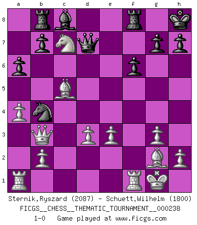 Last move : 1-0 2021 March 23 19:27:18 [Event "FICGS__CHESS__THEMATIC_TOURNAMENT__000238"] [Site "FICGS"] [Date "2020.10.16"] [Round "1"] [White "Sternik,Ryszard"] [Black "Schuett,Wilhelm"] [Result "1-0"] [WhiteElo "2087"] [BlackElo "1800"] 1.c4 Nf6 2.Nc3 c5 3.g3 d5 4.cxd5 Nxd5 5.Bg2 Nc7 6.Nf3 Nc6 7.O-O Rb8 8.d3 e5 9.Nd2 Qd7 10.Nc4 f6 11.a4 Be7 12.f4 exf4 13.Bxf4 O-O 14.Nb5 Bd8 15.e3 a6 16.Nb6 Qe7 17.Nxc7 Bxc7 18.Nd5 Qd7 19.Bxc7 Ra8 20.Bb6 Nb4 21.Nc7 Rb8 22.Qb3+ Kh8 23.Bxc5 1-0 Follow this game move after move (download)I like to say that Bobby Fischer was the greatest player ever. But what made Fischer a genius was his ability to blend an American freshness and pragmatism with Russian ideas about strategy. (Bruce Pandolfini) Im Schach gibt es keinen Platz für Galanterie. (Irving Chernev) Botvinnik trataba de restarle el misterio al Ajedrez, siempre relacionandolo a situaciones de la vida ordinaria. El gustaba de llamar al Ajedrez un típico problema inexacto similar a aquellos de los cuales la gente siempre tiene que enfrentarse en la vida cotidiana. (Garry Kasparov) La solitude du joueur d'Echecs à l'approche du mat est semblable à celle du condamné. (Francis Szpiner) Creativity is allowing yourself to make mistakes. Art is knowing which ones to keep. (Scott Adams)