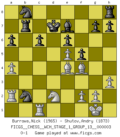 Last move : 0-1 2007 September 17 20:49:12 [Event "FICGS__CHESS__WCH_STAGE_1_GROUP_13__000003"] [Site "FICGS"] [Date "2007.07.11"] [Round "1"] [White "Burrows,Nick"] [Black "Shutov,Andry"] [Result "0-1"] [WhiteElo "1965"] [BlackElo "1873"] 1.e4 Nf6 2.e5 Nd5 3.d4 d6 4.Nf3 Bg4 5.Be2 e6 6.O-O a6 7.c4 Nb6 8.h3 Bxf3 9.Bxf3 dxe5 10.dxe5 Qxd1 11.Rxd1 Nxc4 12.Bxb7 Ra7 13.Be4 c6 14.Bf4 Nxb2 15.Rc1 Rb7 16.Nd2 Kd7 17.a4 Be7 18.Ra2 f5 0-1 This chess game has been lost on time (started : 2007.07.11 17:9:35) Alekhine's defense : Modern variation, 4...Bg4 Kingside Castling by player White (move 6) Player Black won this chess game. Follow this game move after move (download)Place the contents of the Chess box in a hat, shake them up vigorously, pour them on the board from a height of two feet, and you get the style of Steinitz. (H. E. Bird) Es genügt nicht ein guter Spieler zu sein, man muß auch gut spielen. (Siegbert Tarrasch) El Ajedrez tiene tanto misterio como las mujeres. (Purdy) J'ai toujours senti une vague pitié pour l'homme qui ne connaît rien aux échecs, tout comme j'en aurais pour un homme ignorant de l'amour. Les Echecs, comme la musique ou comme l'amour, ont le pouvoir de rendre heureux. (Siegbert Tarrasch) Live, lose, and learn, by observing your opponent how to win. (Amber Steenbock)